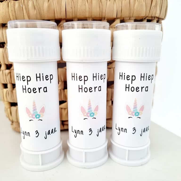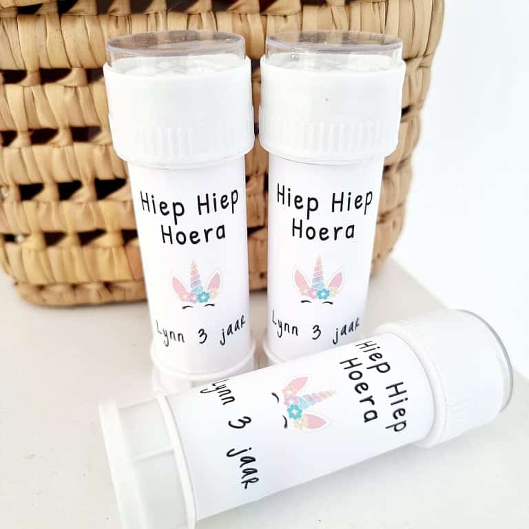 Deze gepersonaliseerde bellenblaas is speciaal ontworpen voor echte unicorn fans. Het label wordt volledig bedrukt met jouw eigen tekst. Denk aan “Hoera Lisa 2 jaar!” of “Hieperdepiep hoera Liv is 2 jaar!”. Zo maak je van een simpele bellenblaas een unieke en persoonlijke traktatie.