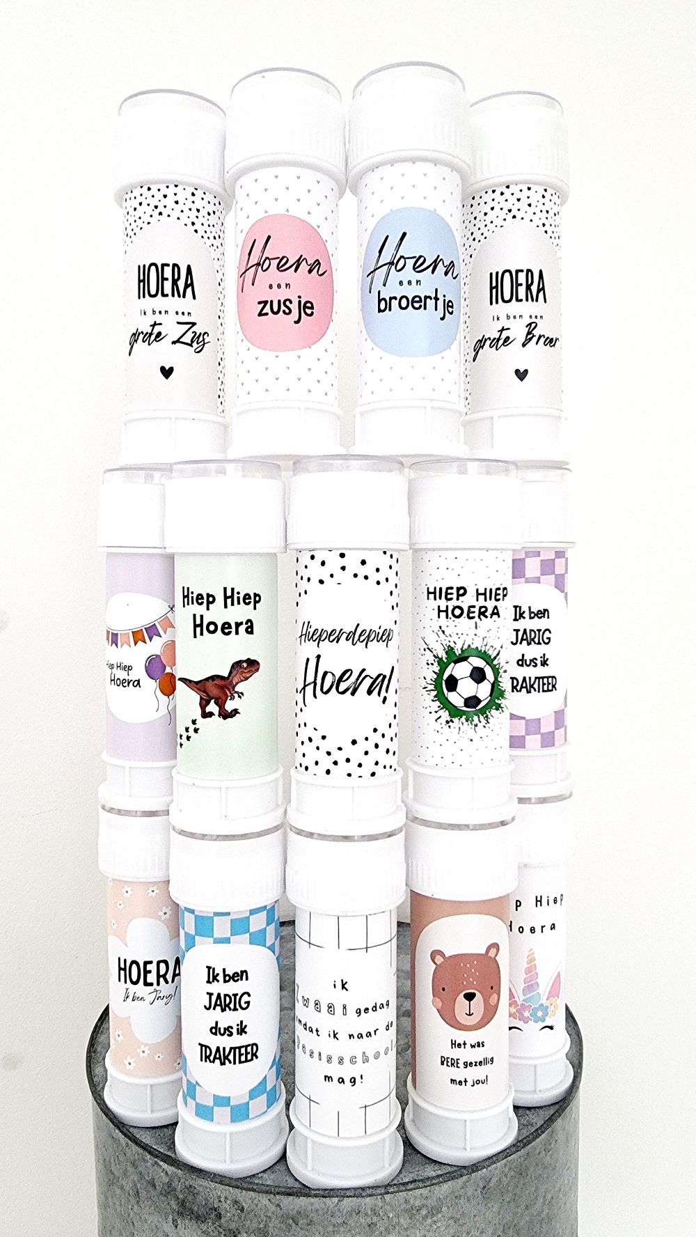 Wil je het nog makkelijker maken? Bestel de labels inclusief bellenblaas. Wij plakken de stickers alvast op witte bellenblaasflesjes, zodat ze direct klaar zijn om uit te delen – ideaal voor een feestje, traktatie of bedankje.