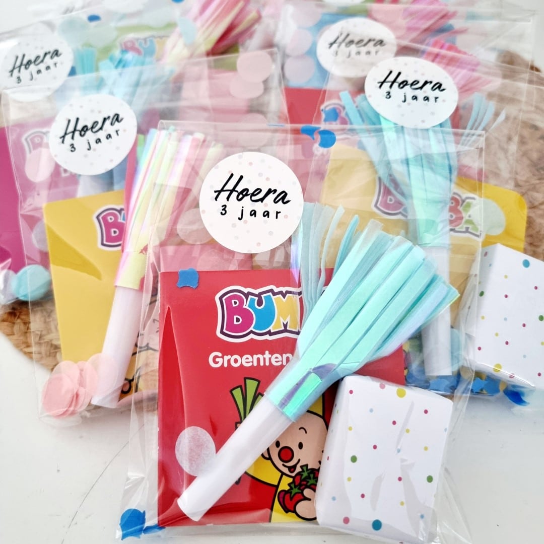 Met het Bumba uitdeelboekje geef je een vrolijke en direct uitdeelbare traktatie waar peuters en kleuters blij van worden. De kleurrijke Bumba boekjes in combinatie met een verantwoord tussendoortje en feestelijke confetti zorgen voor een traktatie met hoge attentiewaarde zonder voorbereiding.