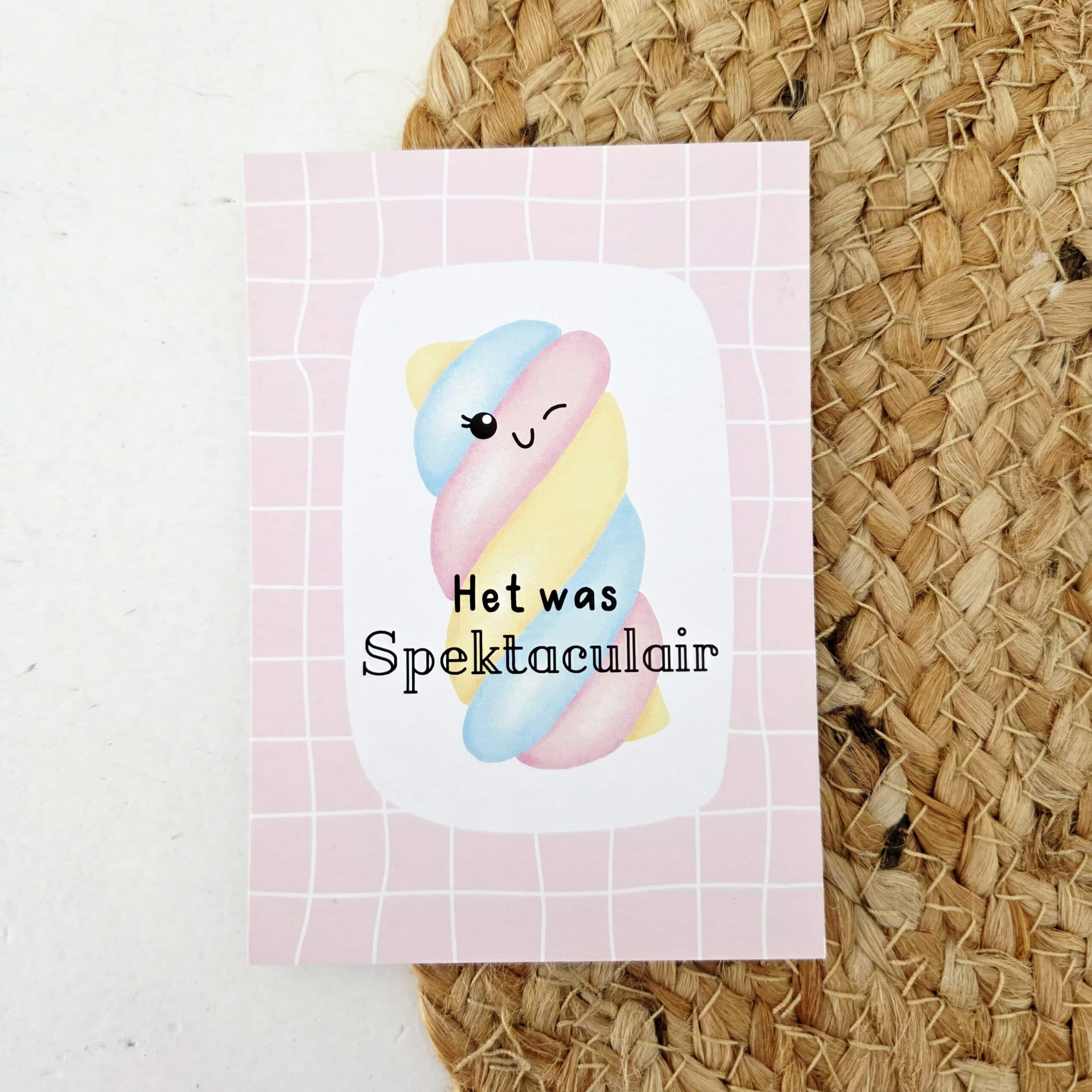 Een bijzondere dag, geslaagd feestje of fijne samenwerking afsluiten met een glimlach. Met deze A7 cadeaukaart Het was spektaculair laat je op een speelse en positieve manier weten dat je hebt genoten. Het zachte roze ruitdesign met vrolijke illustratie geeft het kaartje een frisse en moderne uitstraling.