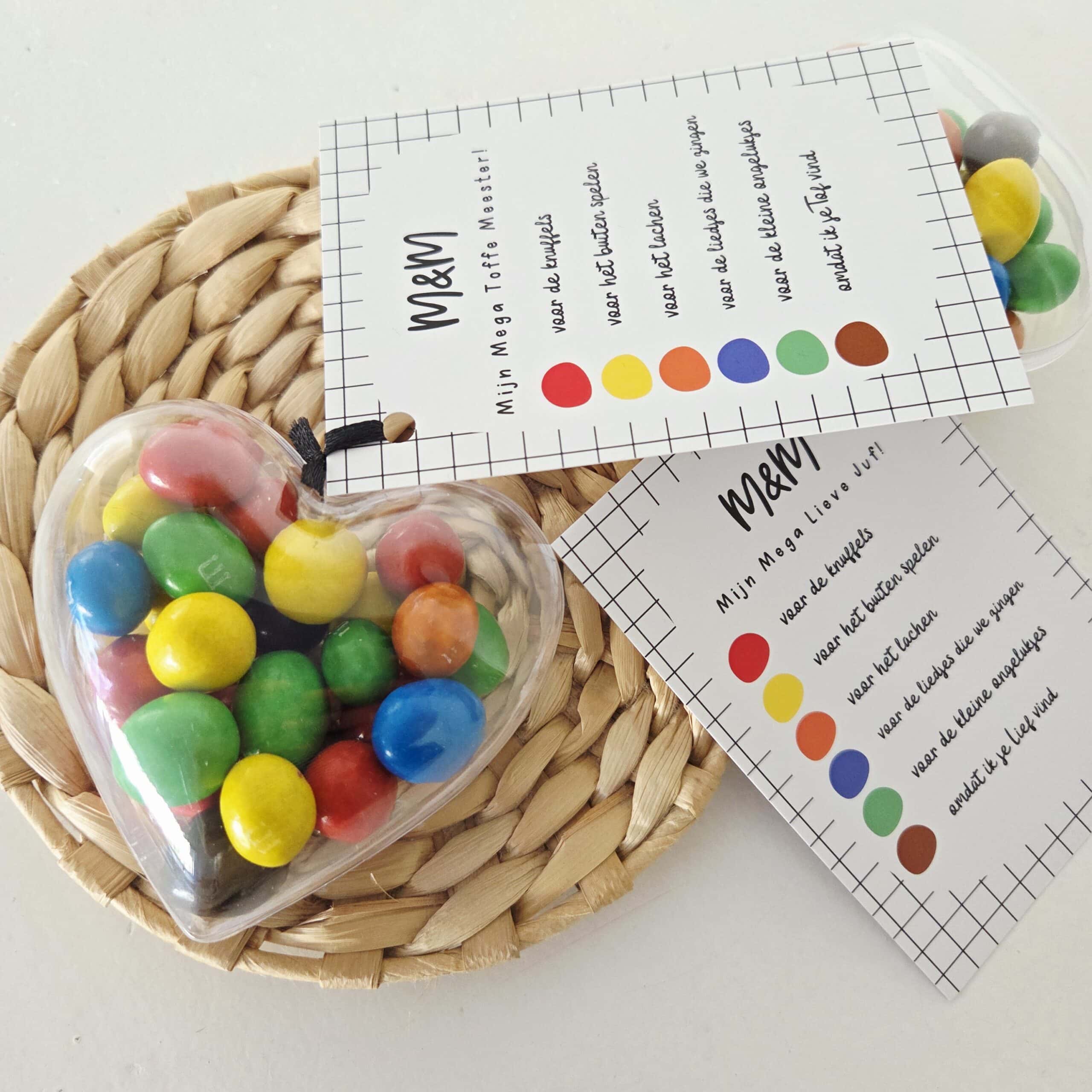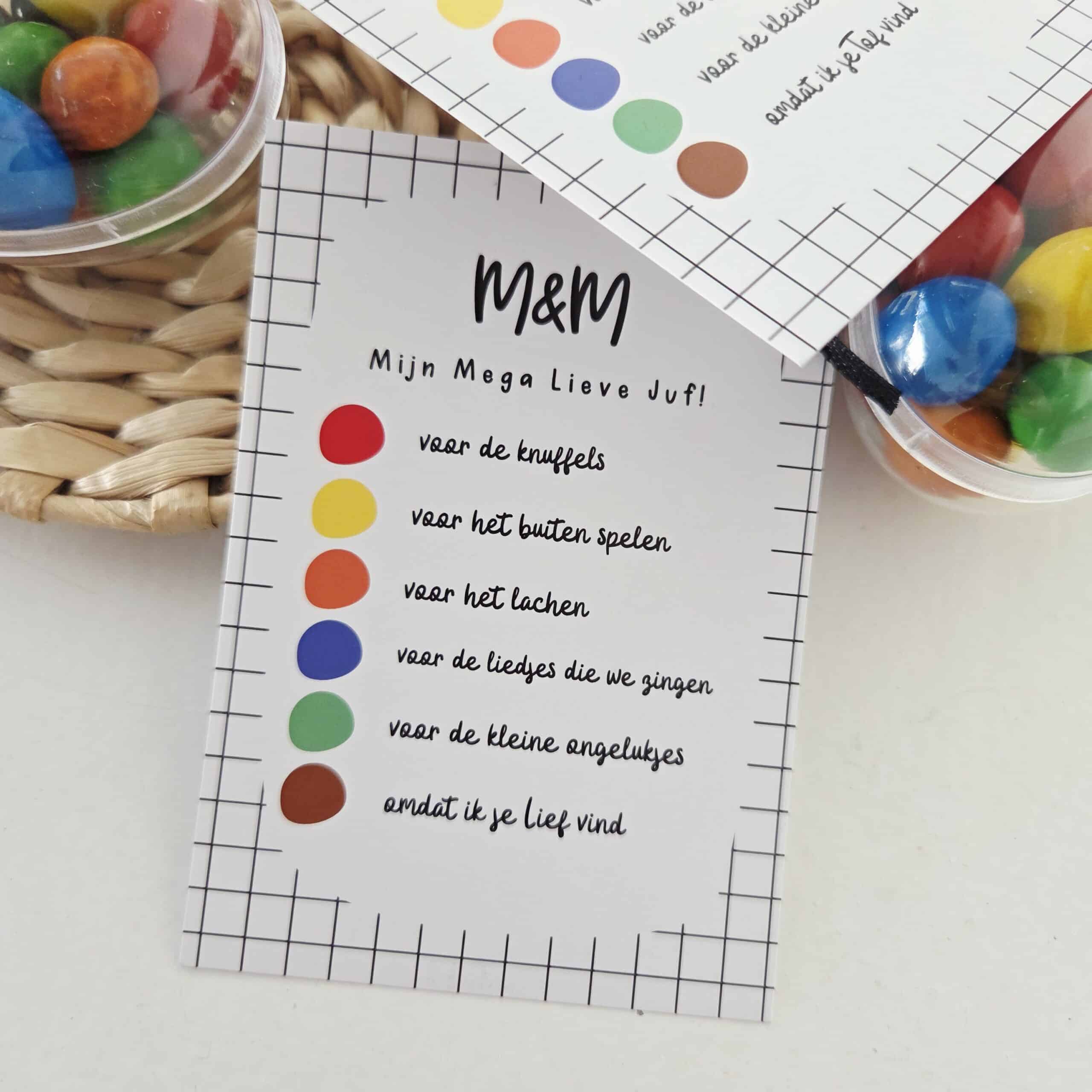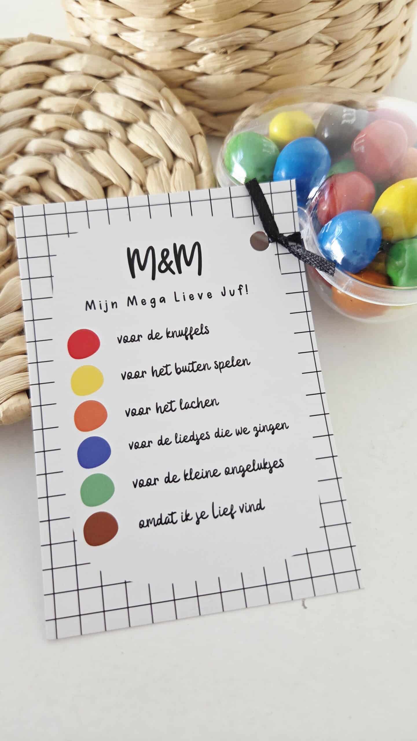 Dit cadeaukaartje is ideaal voor het einde van het schooljaar, juffendag of een afscheid in de klas. Door het originele concept met M en M is het extra leuk om te combineren met snoep of een klein cadeautje.
