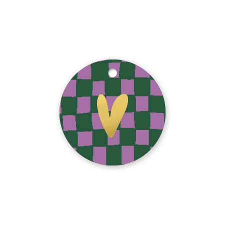 Maak van elk cadeautje iets bijzonders met dit ronde cadeaulabel met gouden hart. De combinatie van paars en donkergroen in een speels ruitpatroon zorgt voor een trendy uitstraling. Het glanzende gouden hart in het midden maakt het label helemaal af – een klein detail dat groot effect heeft.