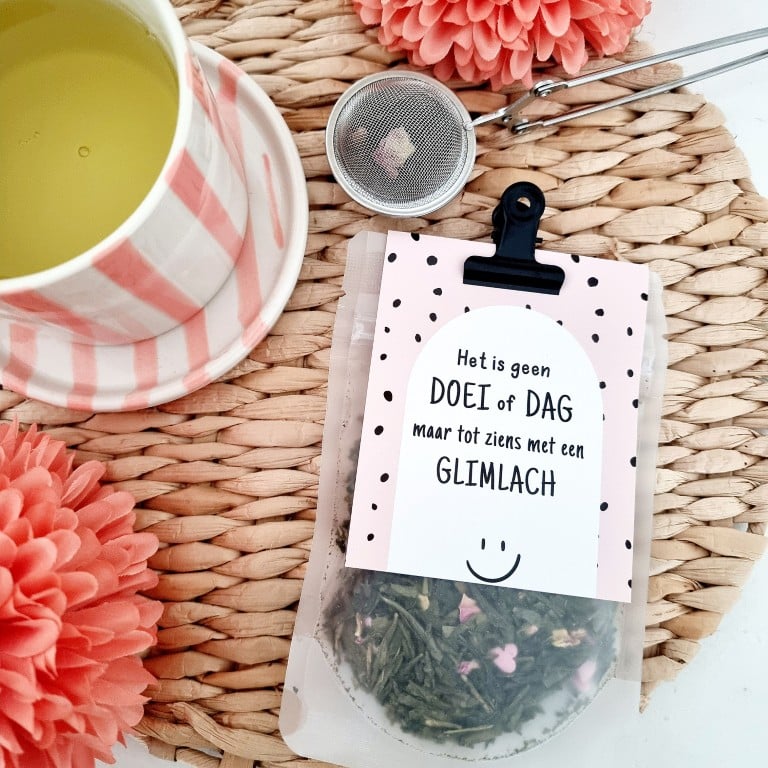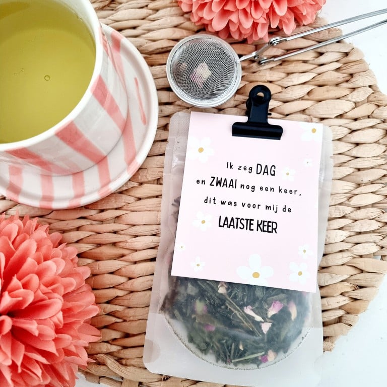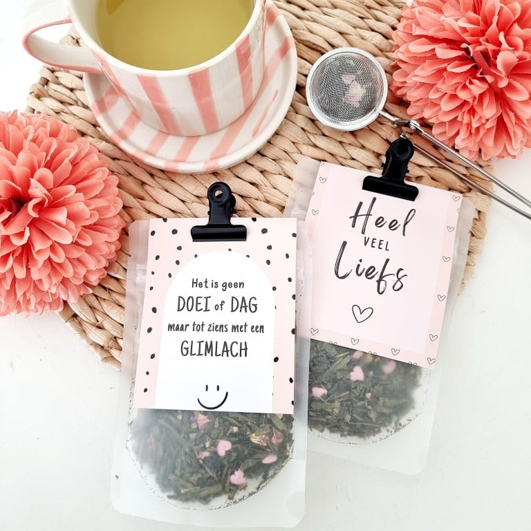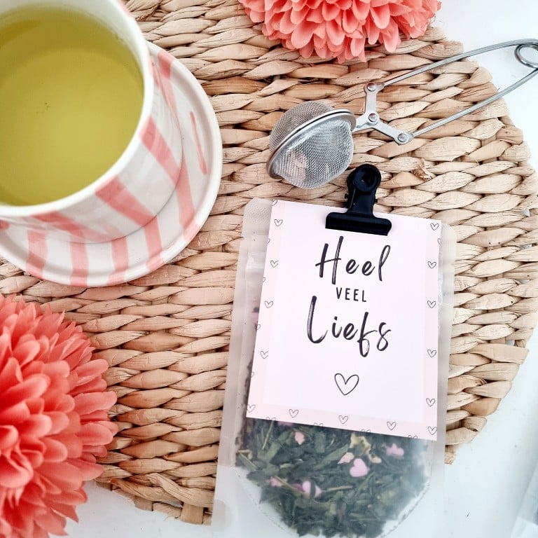 Voor een extra compleet cadeau kun je kiezen voor een hartvormige theezeef. Wanneer je dit toevoegt, wordt de thee samen met de zeef in een transparant zakje verpakt. Dit zorgt voor een mooi en praktisch geschenk dat direct klaar is voor gebruik.