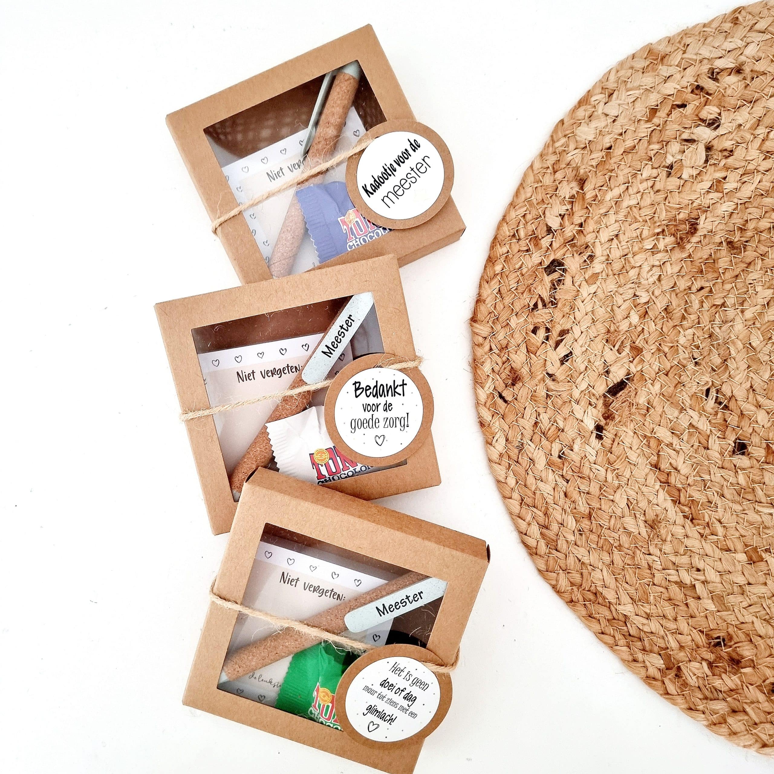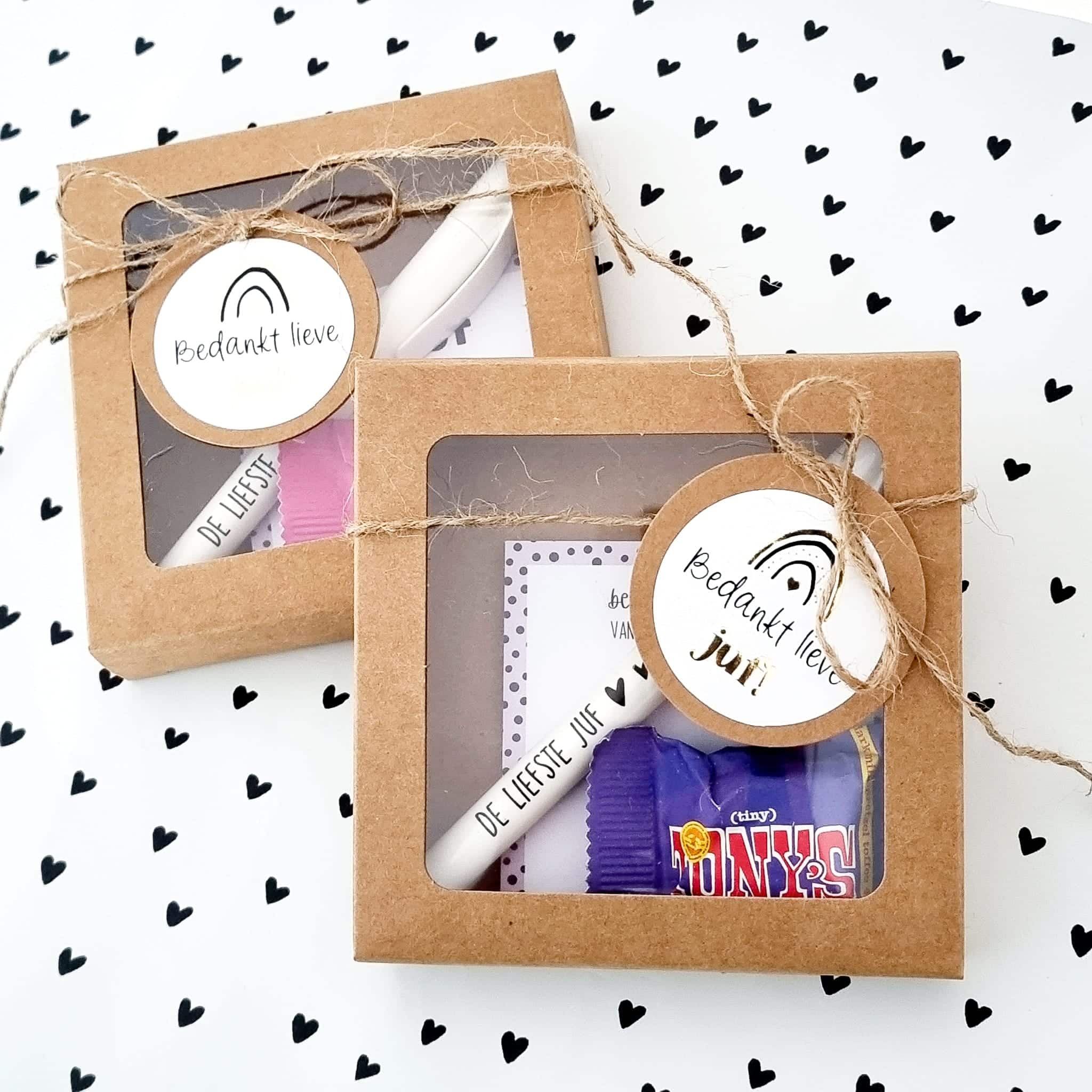 Het stevige kraft doosje heeft een formaat van 10,5 x 10,5 cm en is voorzien van een transparant venster. Dankzij het natuurlijke materiaal oogt het pakketje verzorgd en stoer tegelijk. Je kiest zelf een sticker die past bij de gelegenheid, zoals “Bedankt meester”, “Fijne zomervakantie” of een neutrale variant.