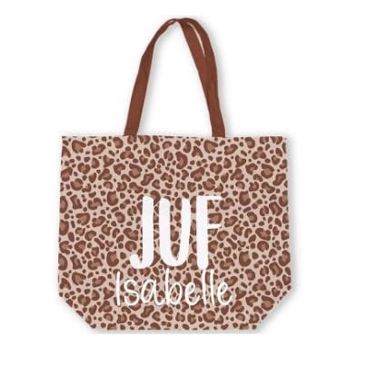 Wil je een origineel en praktisch cadeau geven? Kies dan voor deze canvas tas met panterprint en naam en verras de juf met een persoonlijk aandenken dat ze elke dag kan gebruiken.