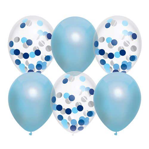 De set bestaat uit 6 ballonnen: 3 effen blauwe ballonnen en 3 transparante ballonnen gevuld met confetti in blauw en zilver. Samen vormen ze een speels en elegant geheel – ideaal voor feesten met een jongens- of winterthema.