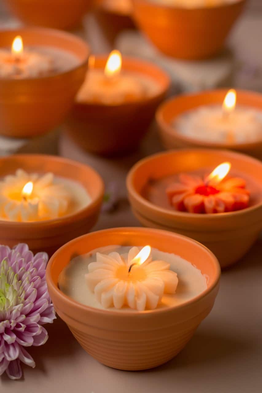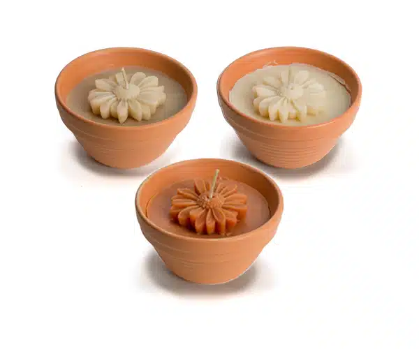 Decoratieve bloemkaars in terracotta schaaltje