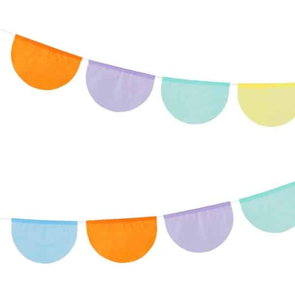 De slinger bestaat uit halfronde vlaggetjes in meerdere vrolijke kleuren. Door de zachte textuur van het papier krijgen de kleuren een luchtige en lichte uitstraling, waardoor de decoratie zowel speels als stijlvol oogt. Ideaal om een ruimte direct een feestelijke touch te geven.