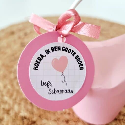 Deze geboortesticker met hart is een stijlvolle manier om te laten zien dat er een grote broer of grote zus is geboren. De sticker heeft een vaste boodschap en kan worden gepersonaliseerd met een afsluitende tekst zoals liefs naam of groetjes naam. Perfect voor traktaties, cadeautjes en geboorte momenten.