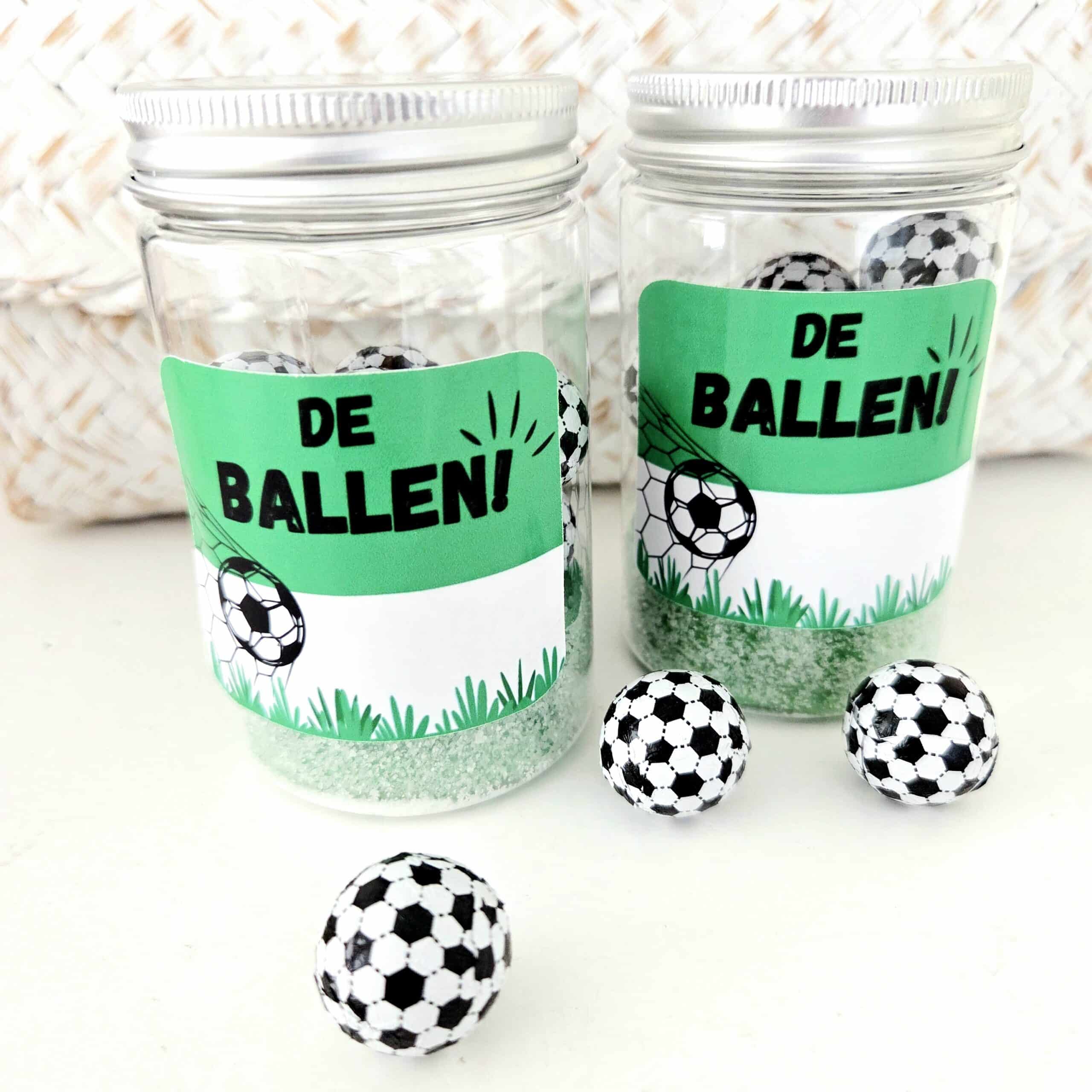 Het gelukspotje De Ballen is een grappig en origineel cadeautje voor voetbalfans. Dit transparante potje met stoer voetbal label is gevuld met lekkere snoepjes en chocolade ballen. Perfect als bedankje na een voetbalfeestje, als traktatie op school of als klein cadeautje voor een echte voetballiefhebber. Een speels presentje dat gegarandeerd een glimlach oplevert.