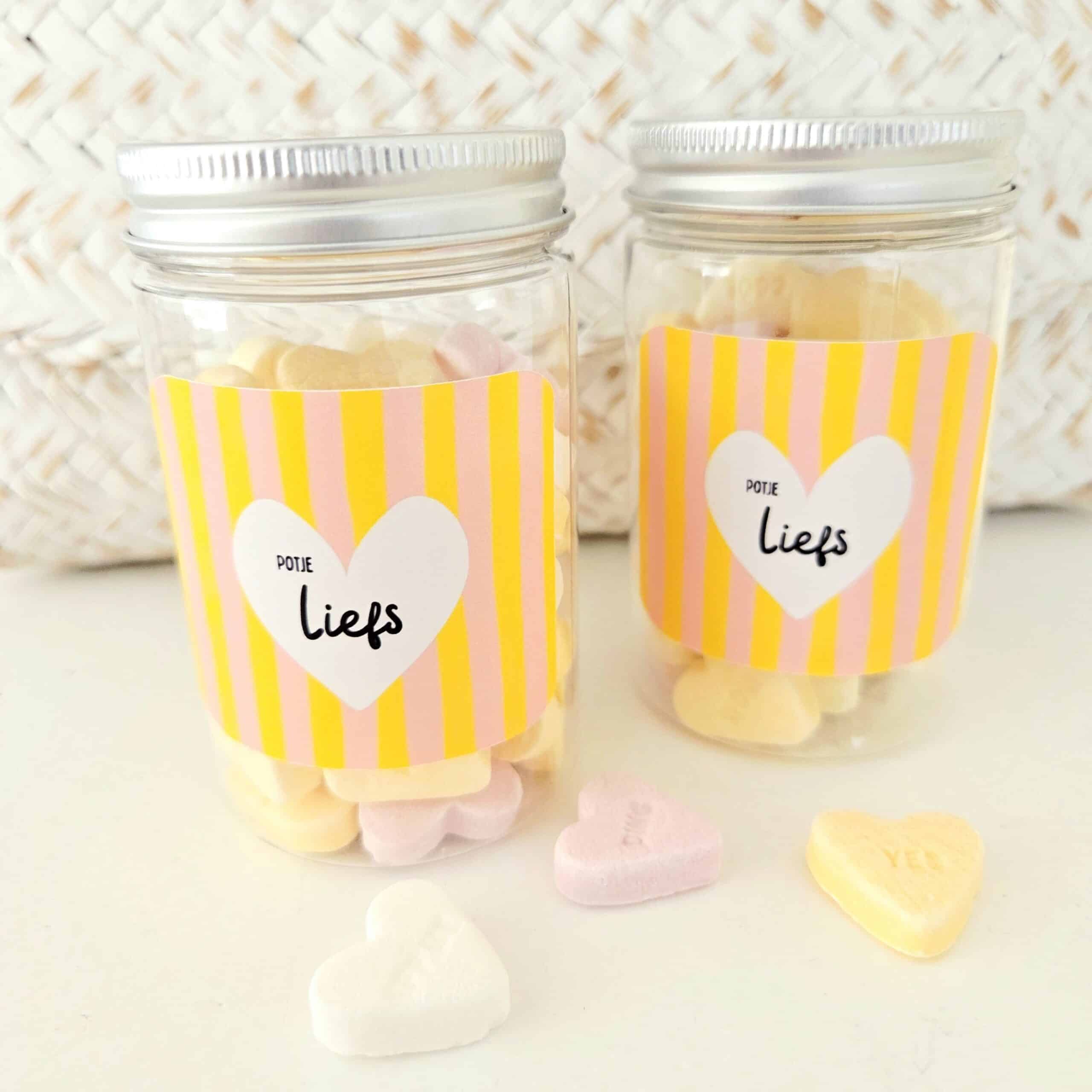 Het potje heeft een speels etiket met de tekst Potje liefs en past bij elke gelegenheid. Denk aan een bedankje voor een collega, een hart onder de riem voor een vriendin of een kleine attentie voor een juf of meester. Door het transparante potje zijn de gekleurde hartjes direct zichtbaar, wat zorgt voor een aantrekkelijke presentatie.
