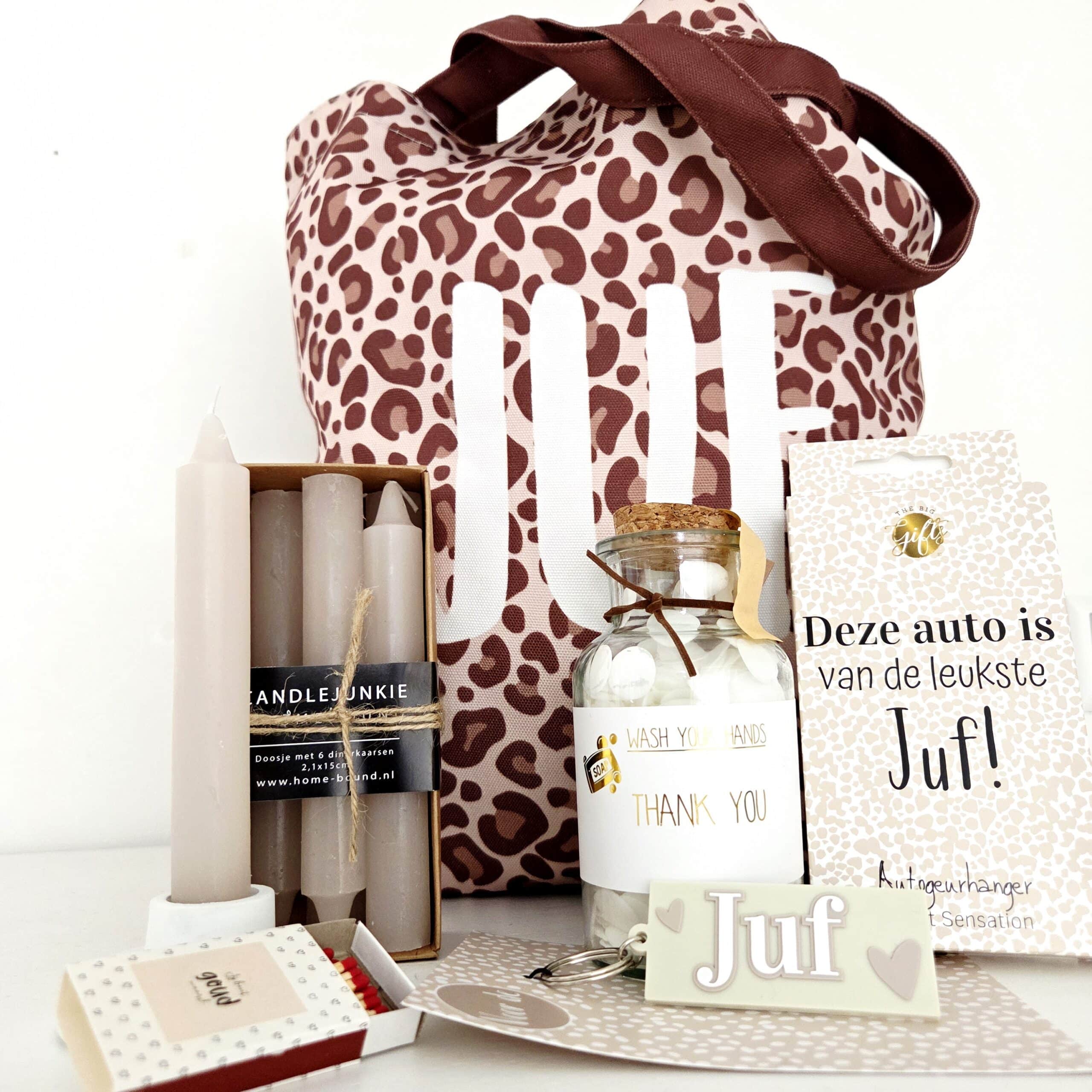 De panterprint tas met opdruk juf maakt het geheel helemaal af en zorgt voor een trendy en herbruikbare verpakking.