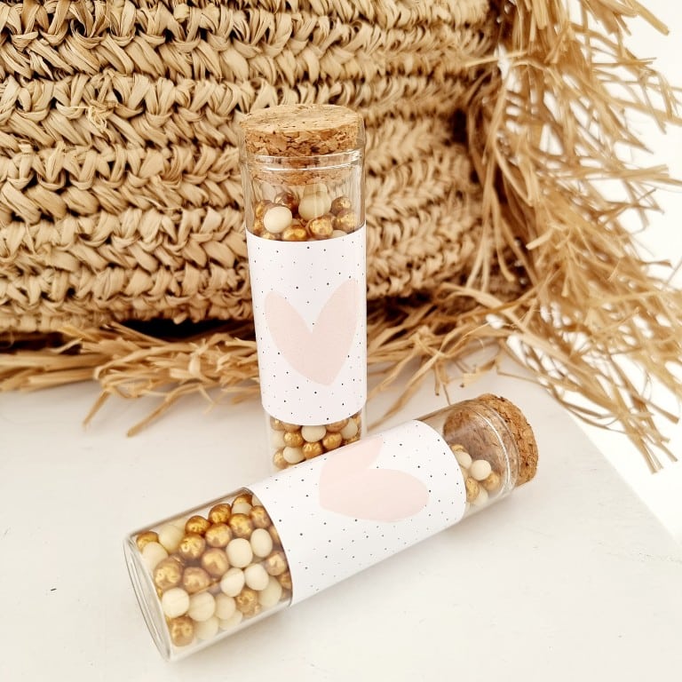 Dit glazen buisje Hart is een lief en stijlvol cadeautje gevuld met mini chocochoops in wit en parelmoer goud. Een klein chocoladepresentje met een zachte uitstraling, perfect om iemand op een mooie en persoonlijke manier te bedanken.