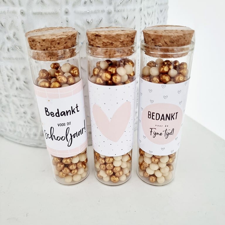 Door het neutrale hartje gebruik je dit glazen buisje als bedankje bij het einde van het schooljaar, als klein cadeautje bij een kaart, als mini traktatie of als presentje in een goodiebag. De luxe chocochoops maken er steeds een feestelijk moment van.