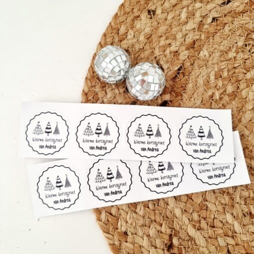 Deze kerststickers met minimalistische kerstbomen passen bij elke kerststijl. Voeg een eigen tekst toe, zoals Warme groet van juf Emma of Fijne kerst van ons gezin, en geef elk geschenk of kaartje een unieke, persoonlijke uitstraling.