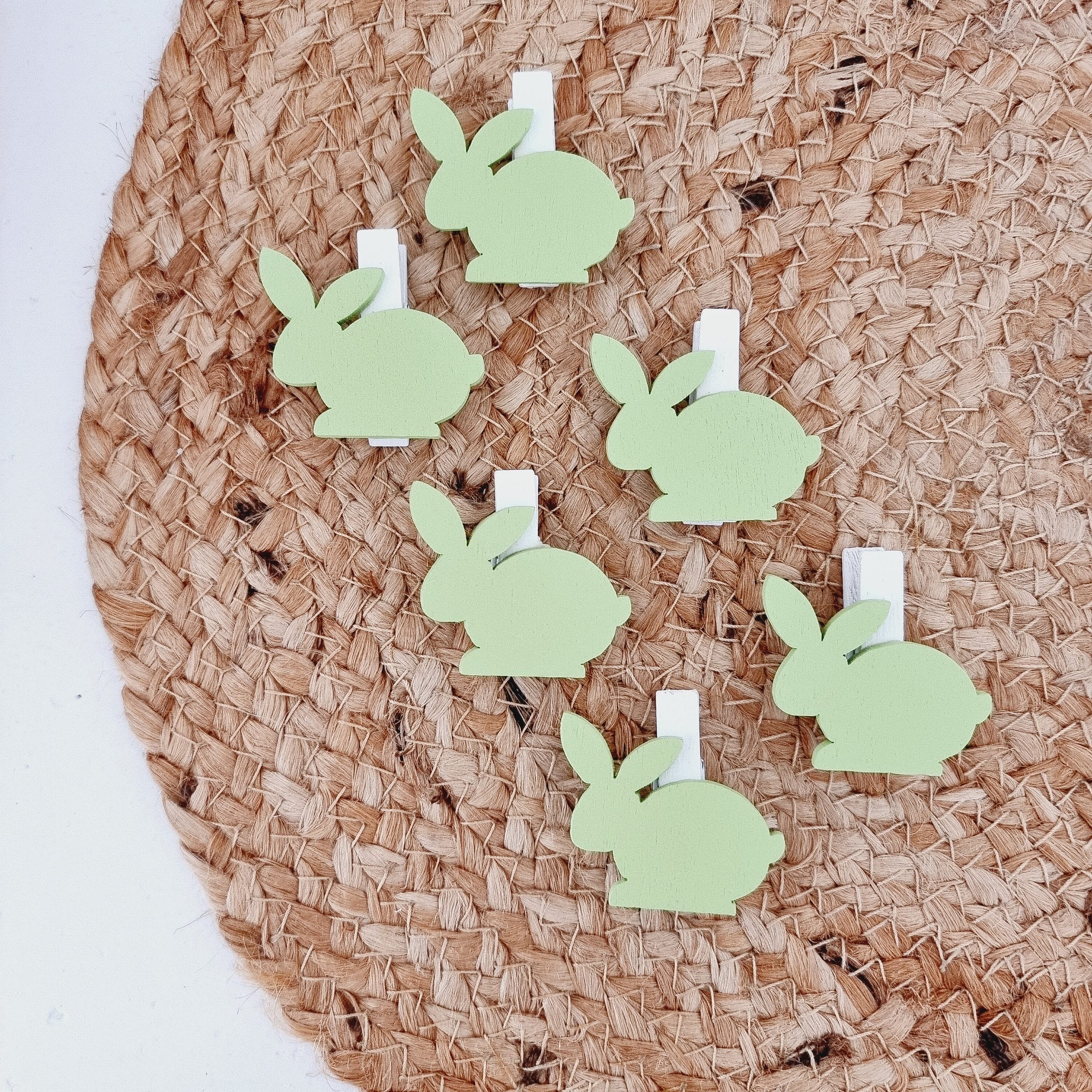 De knijpers zijn uitgevoerd in een zachte groene kleur en hebben de vorm van een paashaasje. Dit geeft direct een natuurlijke en voorjaarsachtige uitstraling. Ze combineren mooi met andere paasartikelen, vooral in pastel en natuurtinten.