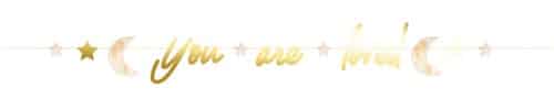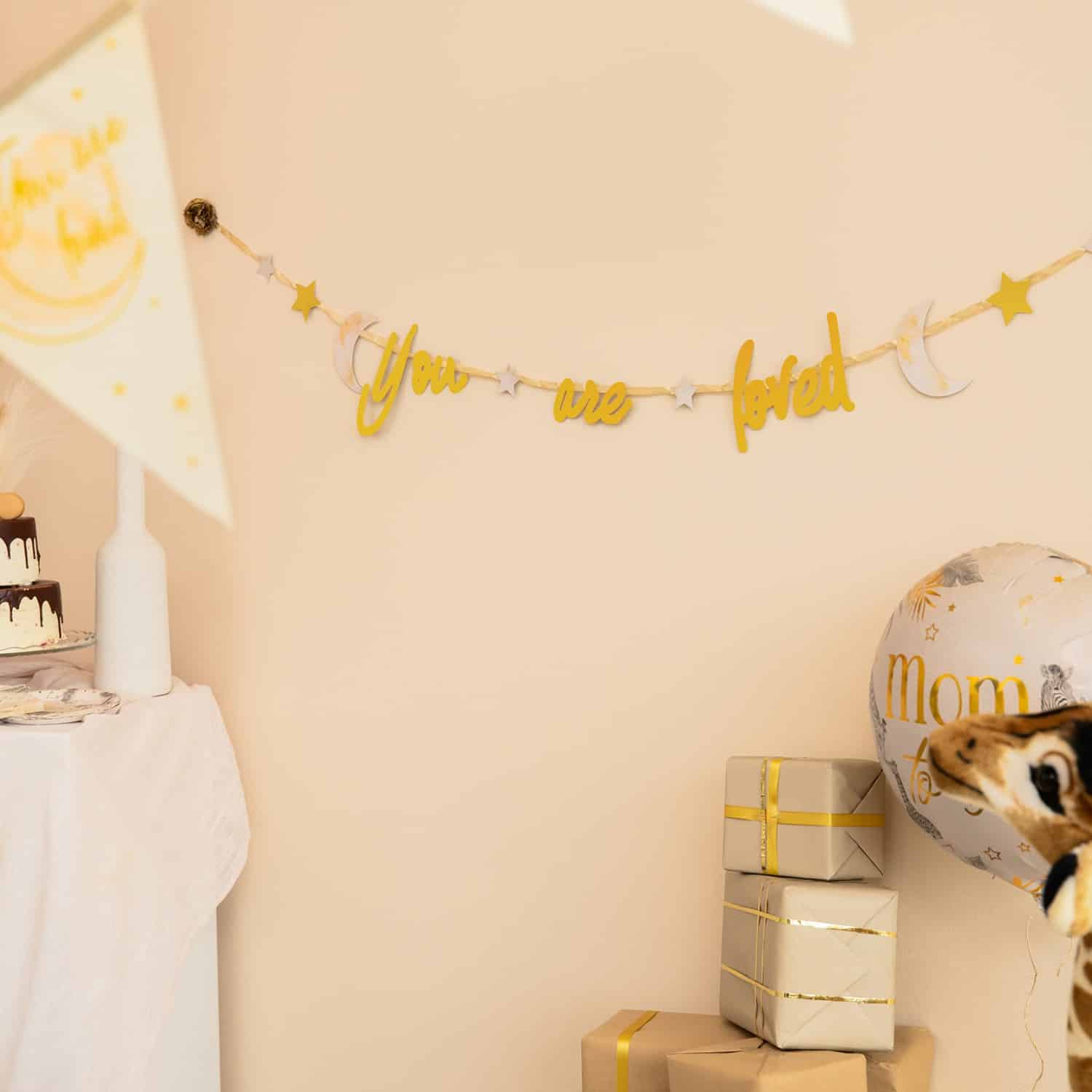 De slinger bestaat uit de gouden tekst “You Are Loved”, afgewisseld met crème sterren en manen. De subtiele kleuren en glanzende afwerking maken het een tijdloos en liefdevol accent voor elke gelegenheid. Ideaal voor een babyfeest met een zachte, natuurlijke uitstraling.