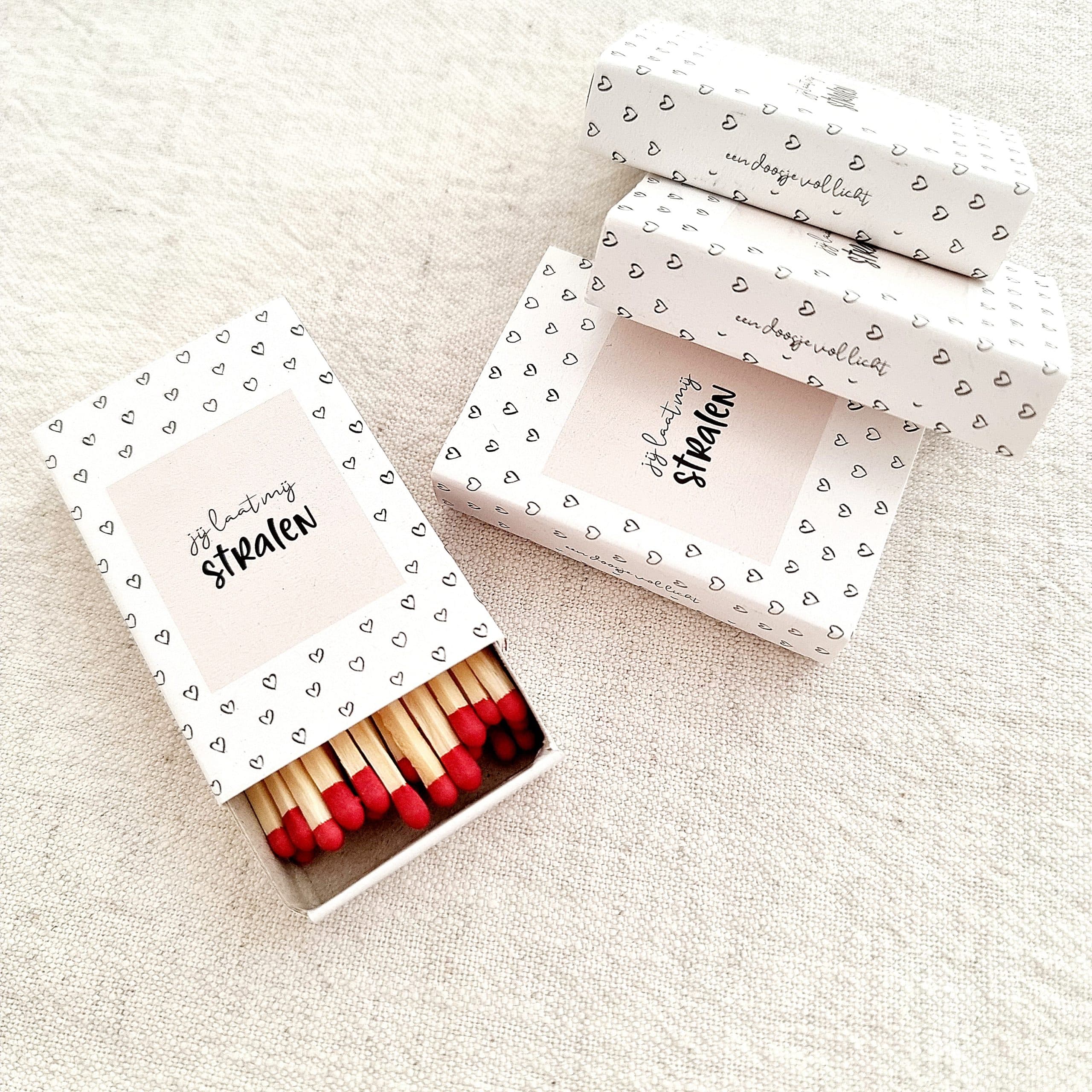 Het luciferdoosje heeft een witte achtergrond met kleine hartjes en een zachte pastelkleurtint in het midden. De tekst ‘Jij laat mij stralen’ springt er subtiel uit – een liefdevolle boodschap verpakt in een stijlvol design dat bij elke gelegenheid past.