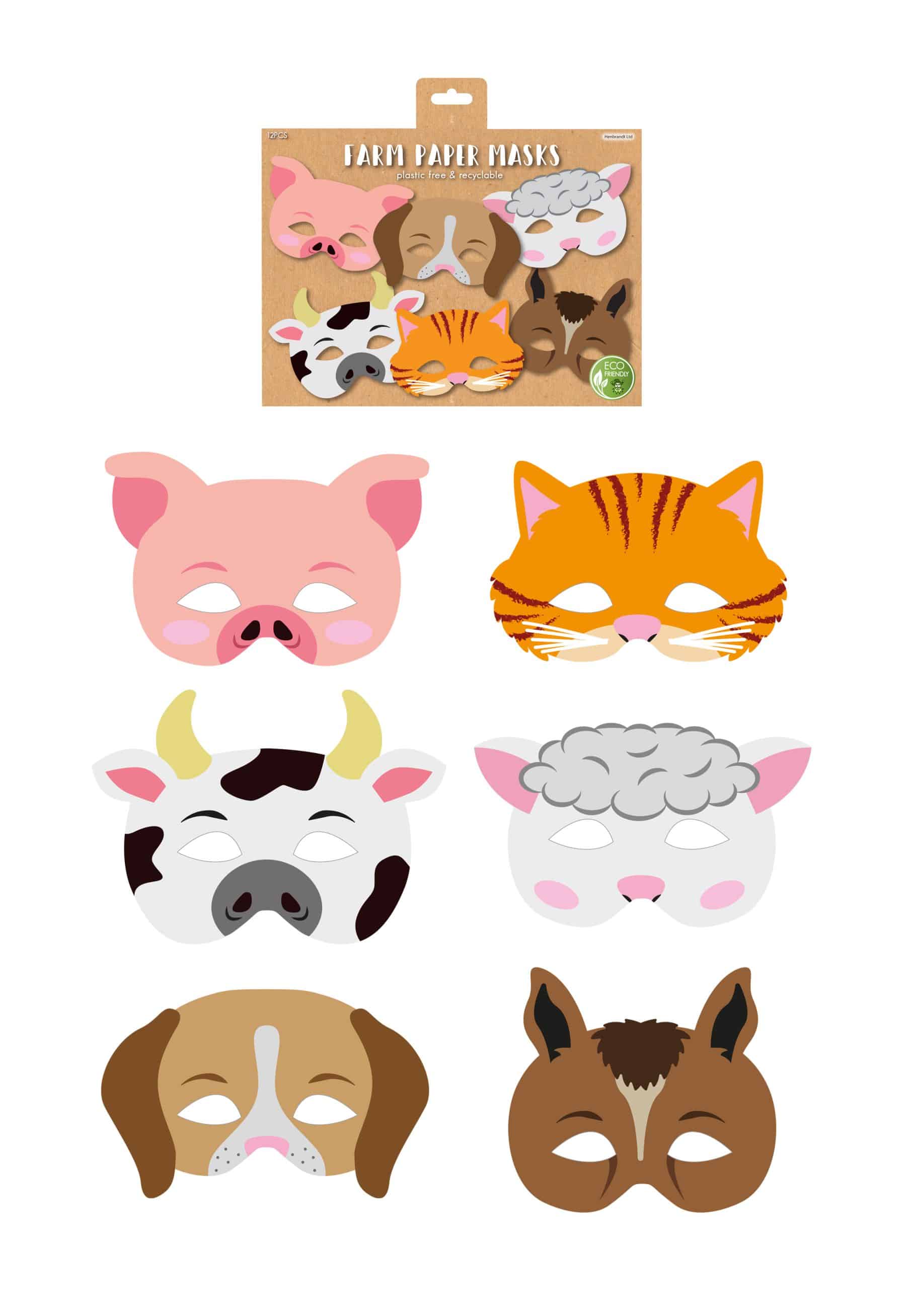 Gebruik deze maskers tijdens een boerderijthemafeest, toneelstuk of fotoshoot. Ook leuk om in te kleuren of te combineren met een verkleedkostuum. De maskers worden geleverd in een transparant zakje van 16,5 x 22 cm – handig om op te bergen of cadeau te geven.