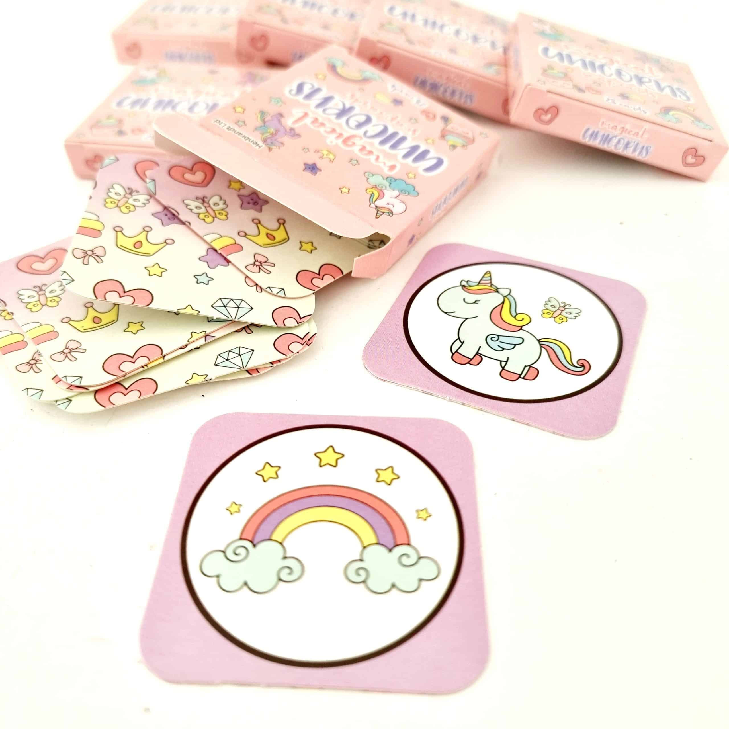 Het eenhoorn memoryspel bevat 28 kaartjes met 14 verschillende, kleurrijke illustraties. Door de herkenbare figuren is het spel eenvoudig te begrijpen en leuk voor kinderen van alle leeftijden – perfect voor kleine droomers en eenhoornfans.