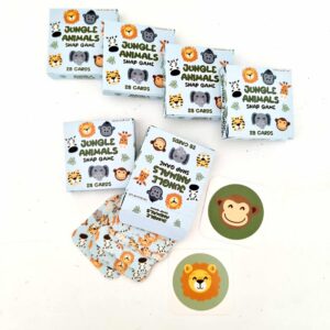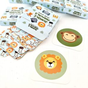 De kaartjes zijn 5,5 x 5,5 cm groot – perfect voor kleine kinderhandjes. Dankzij het compacte doosje neem je het spel gemakkelijk mee. Elke set bevat 6 stuks, handig om te delen of cadeau te geven.