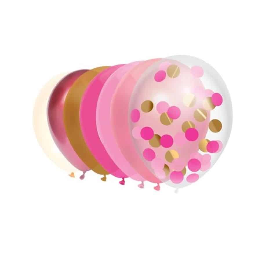 De set bevat een mix van roze, gouden en transparante ballonnen met roze en gouden confetti. De kleuren vullen elkaar prachtig aan en zorgen voor een chique en feestelijke uitstraling. Perfect om te combineren met tafeldecoratie of slingers in dezelfde tinten.