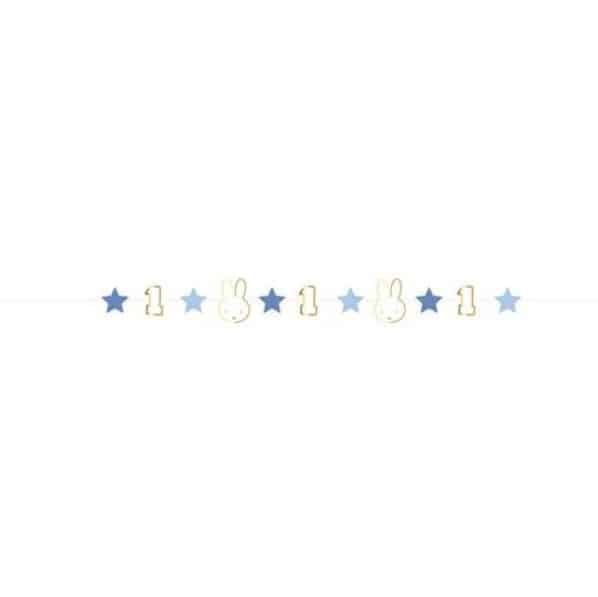 De slinger bestaat uit afwisselende elementen zoals blauwe sterren, het cijfer één en het herkenbare Nijntje-silhouet. De zachte kleuren en de vriendelijke uitstraling passen perfect bij een eerste verjaardag, babyfeest of fotosessie.
