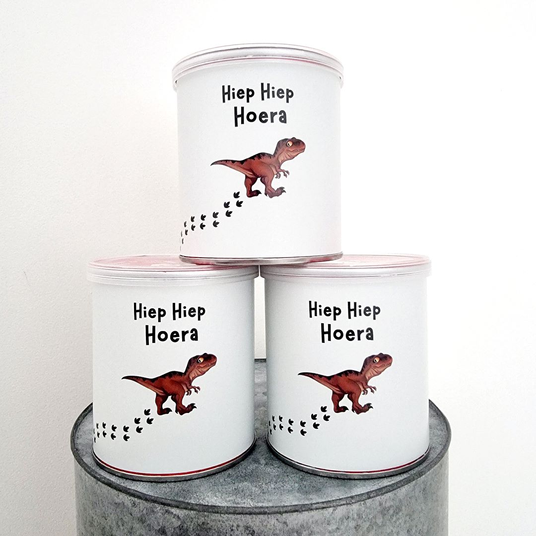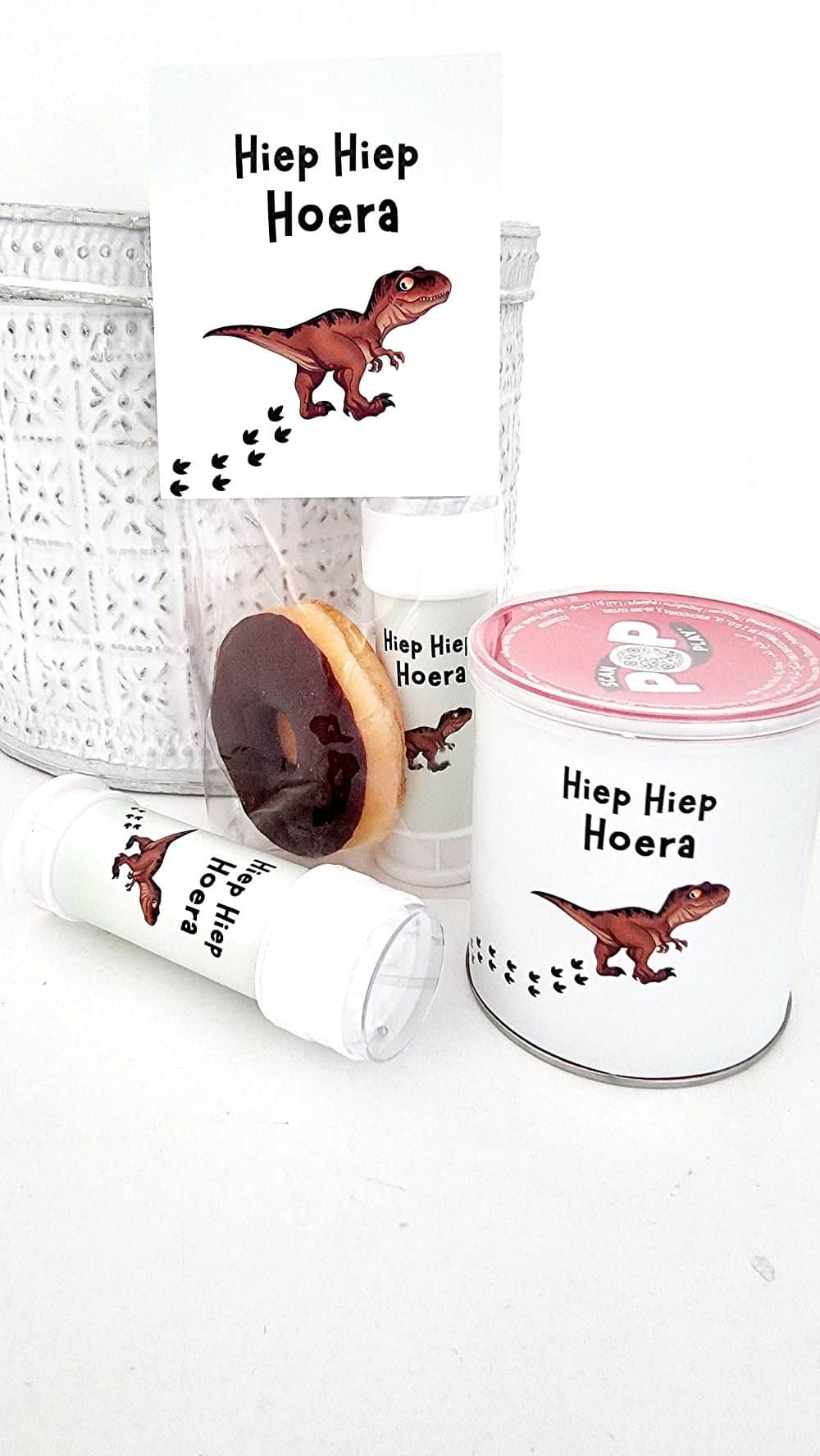 - Design: dinosaurus met tekst “Hiep Hiep Hoera”