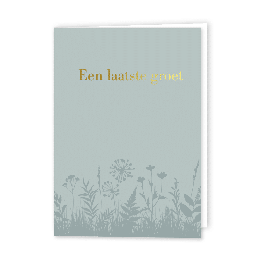 Een stijlvolle rouwkaart om op een respectvolle manier afscheid te nemen. De tekst “Een laatste groet” in goudfolie geeft deze kaart een warme en elegante uitstraling. Deze gevouwen A6 rouwkaart is een passend gebaar om medeleven te tonen en een dierbare herinnering te delen.