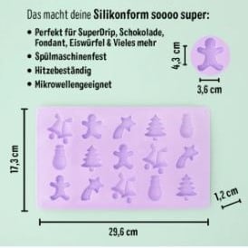 Met deze siliconen mal maak je in een handomdraai prachtige kerstfiguurtjes. Verwarm SuperDrip volgens de instructie op de fles, giet het in de mal en laat de figuren uitharden op kamertemperatuur. Na een paar minuten kun je ze eenvoudig uit de mal halen en op je taart of gebak plaatsen.