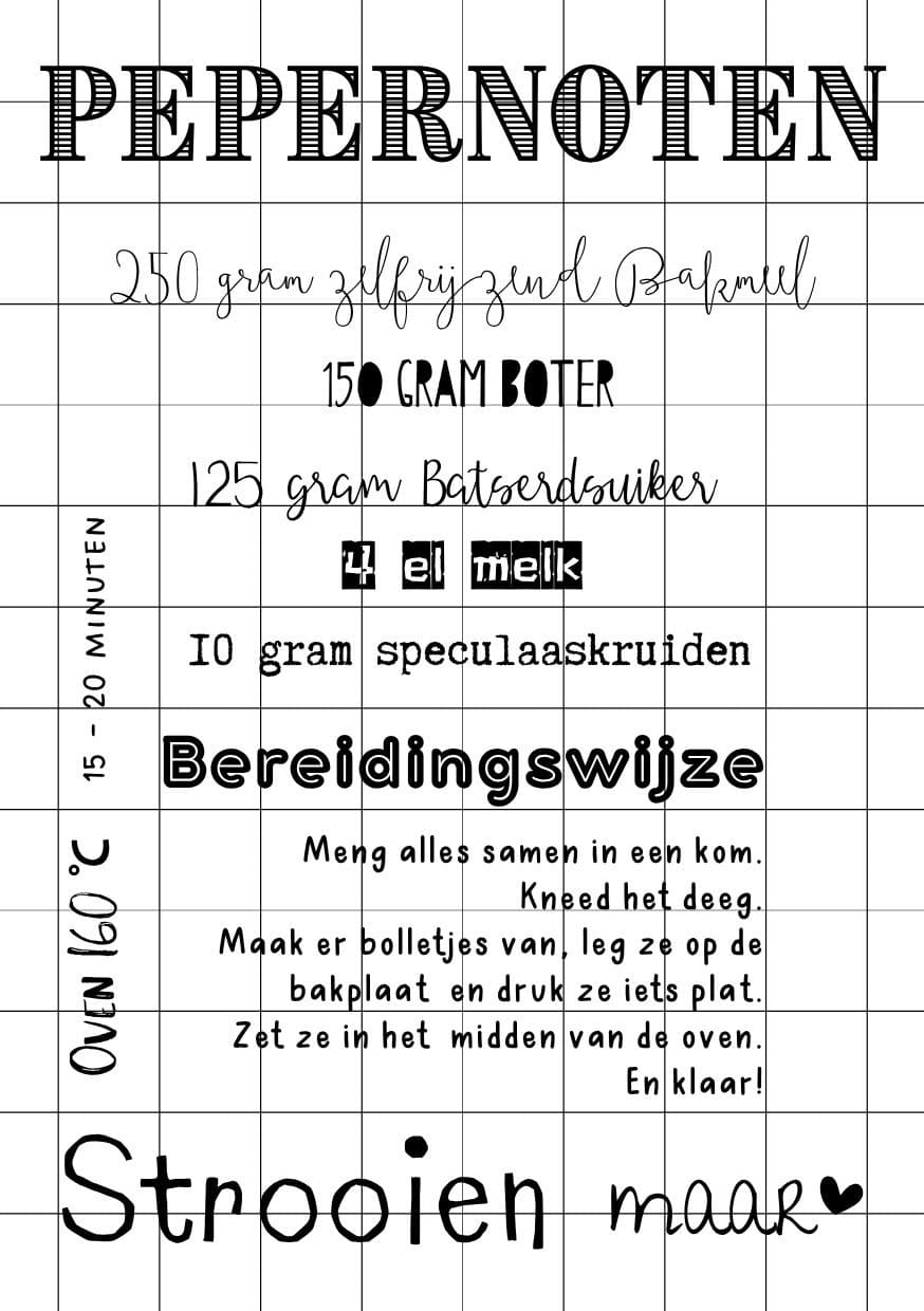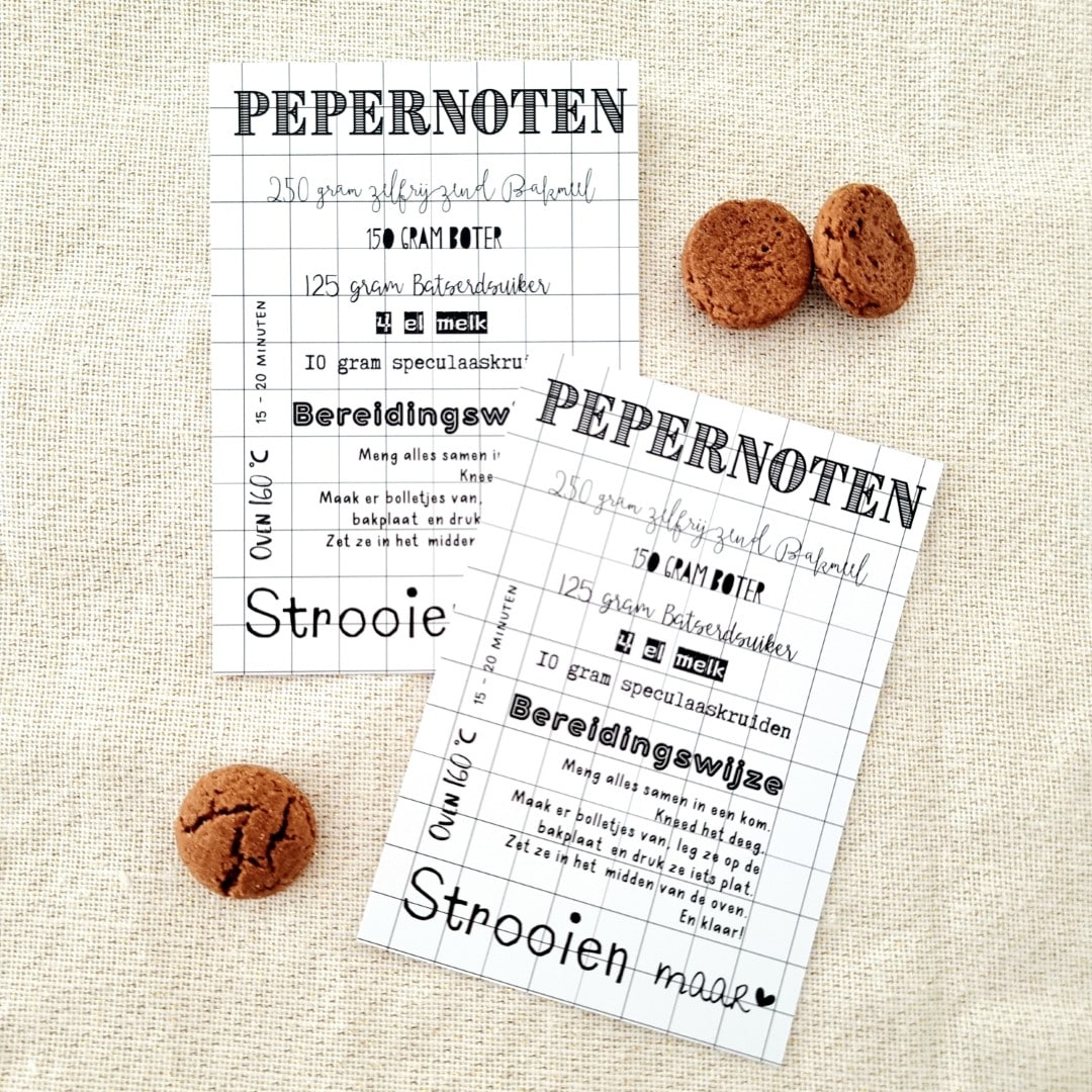 BeschrijvingPepernoten bakken? 🎁 Met dit vrolijke A7-kaartje geef je het recept er gewoon bij! Op het kaartje staat in speelse zwart-wit typografie een duidelijk recept voor pepernoten, inclusief ingrediënten en bereidingswijze.