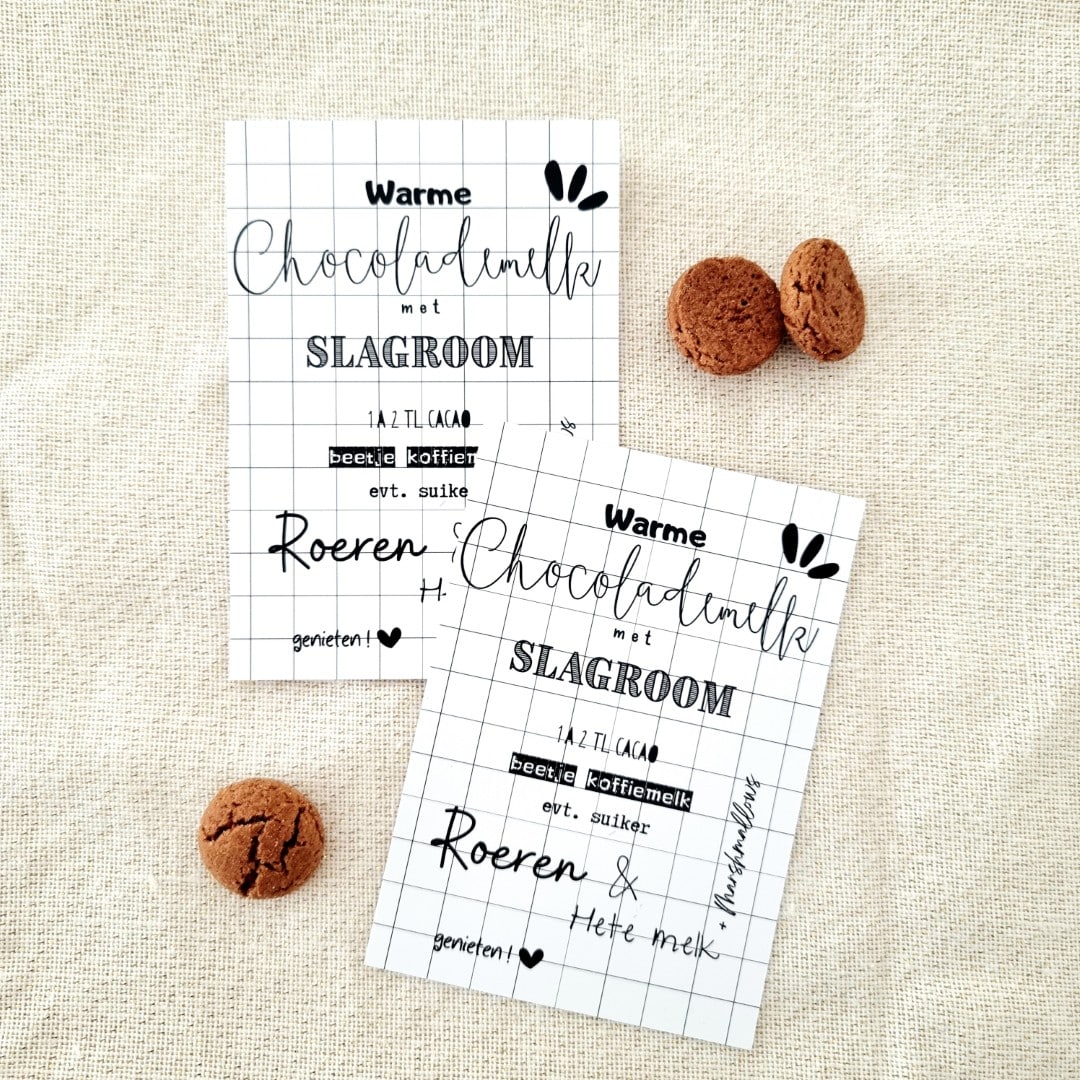 BeschrijvingWarme chocolademelk met slagroom – wie wordt daar niet blij van? 🍫☕ Dit A7-kaartje bevat een gezellig receptje in speelse zwart-wit typografie. Leuk om mee te geven bij een cadeautje, kerstpakket of winterse traktatie.