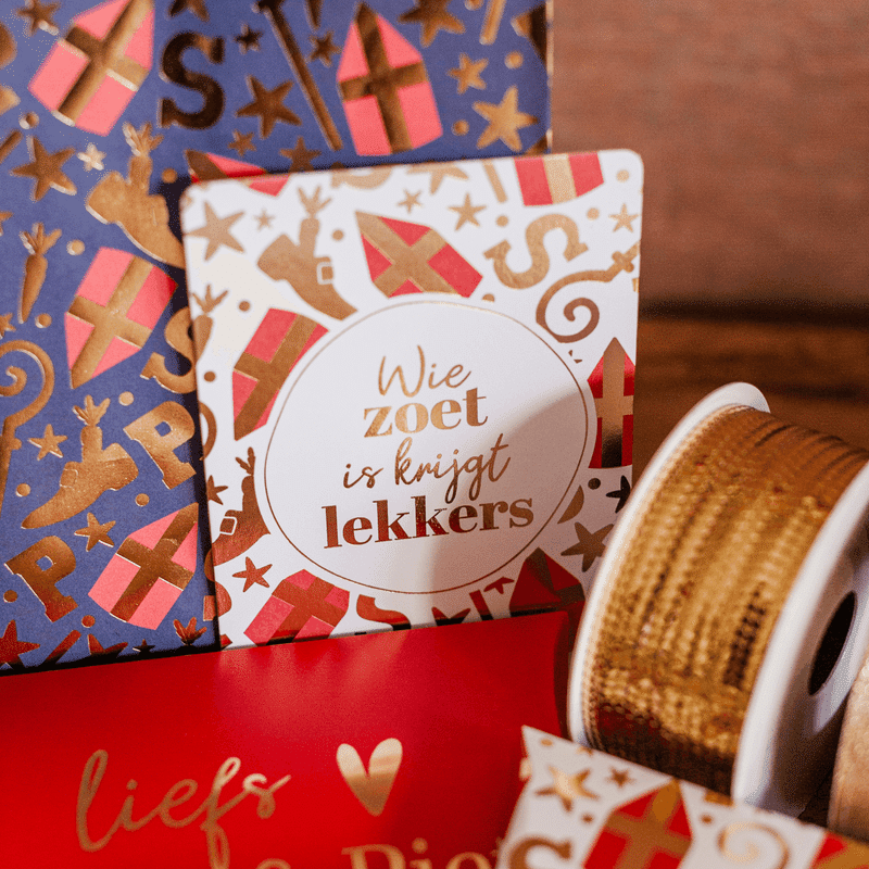 Met de vrolijke print vol mijters, cadeautjes, stafjes en sterren in rood en goud, past deze kaart perfect bij de gezelligheid van pakjesavond. Ideaal om een persoonlijke boodschap te schrijven, bij een schoencadeautje te stoppen of om cadeaus een extra feestelijke touch te geven.