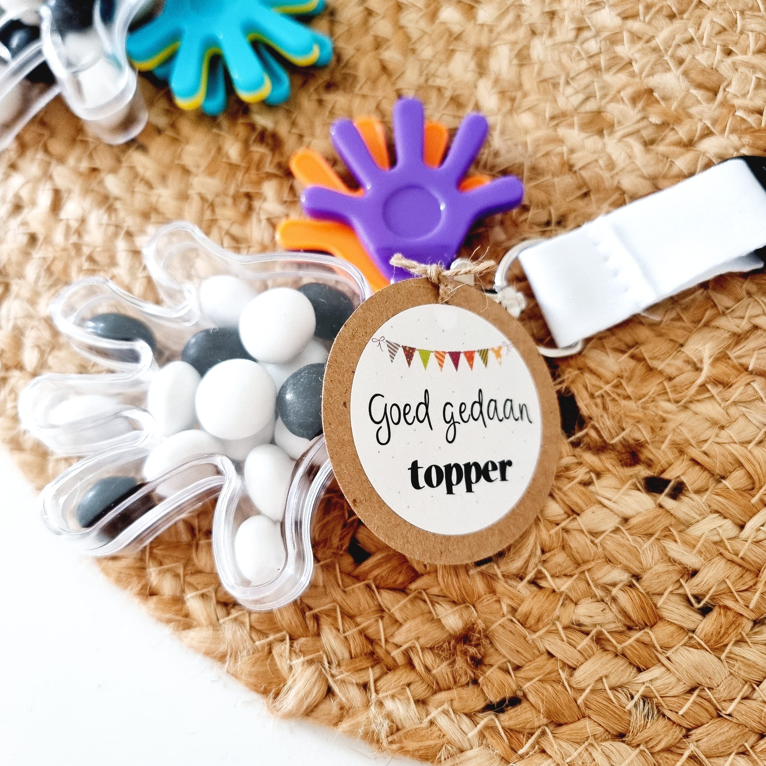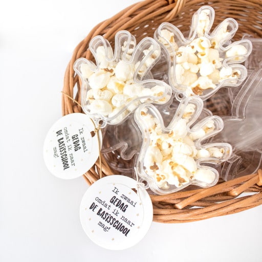 Vrolijk je traktatie op met deze unieke traktatievorm in de vorm van een hand. Vul ze met snoepjes, kleine chocolaatjes of confetti en maak er een persoonlijke afscheidstraktatie van. De handjes zijn compact van formaat en perfect om kinderen te verrassen op school, het kinderdagverblijf of bij een feestje.