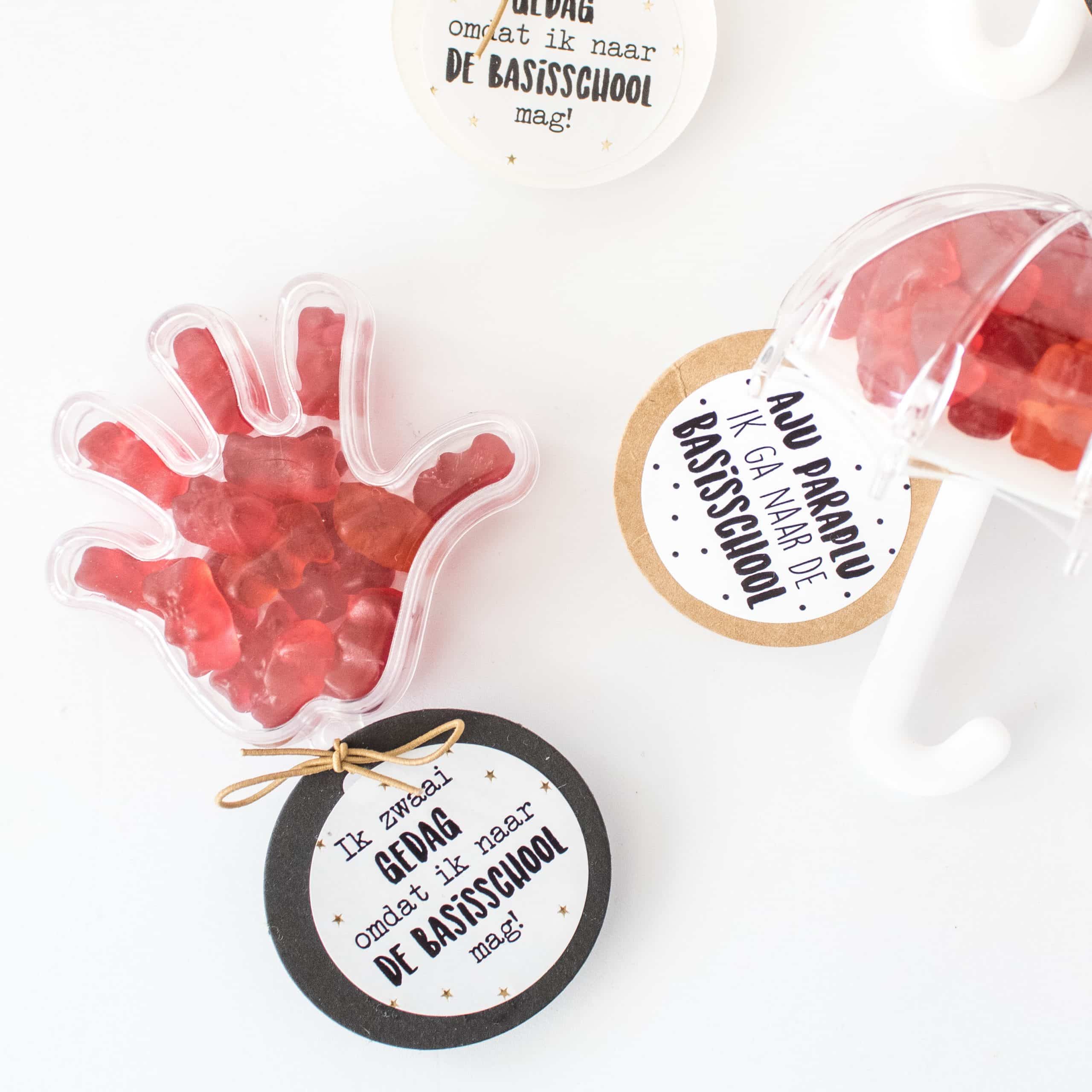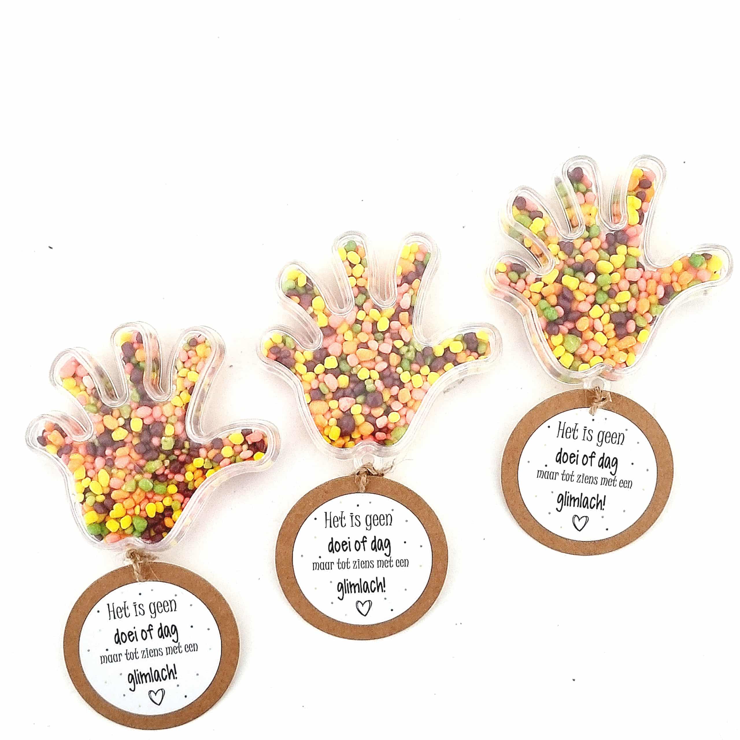 Gebruik deze leuke handvorm bijvoorbeeld als afscheidstraktatie met een kaartje “Het is geen doei maar tot ziens met een glimlach”. Vul ze met lekkers en geef ze mee aan klasgenootjes, collega’s of vriendjes. Een originele en persoonlijke manier om dankjewel te zeggen of afscheid te nemen.