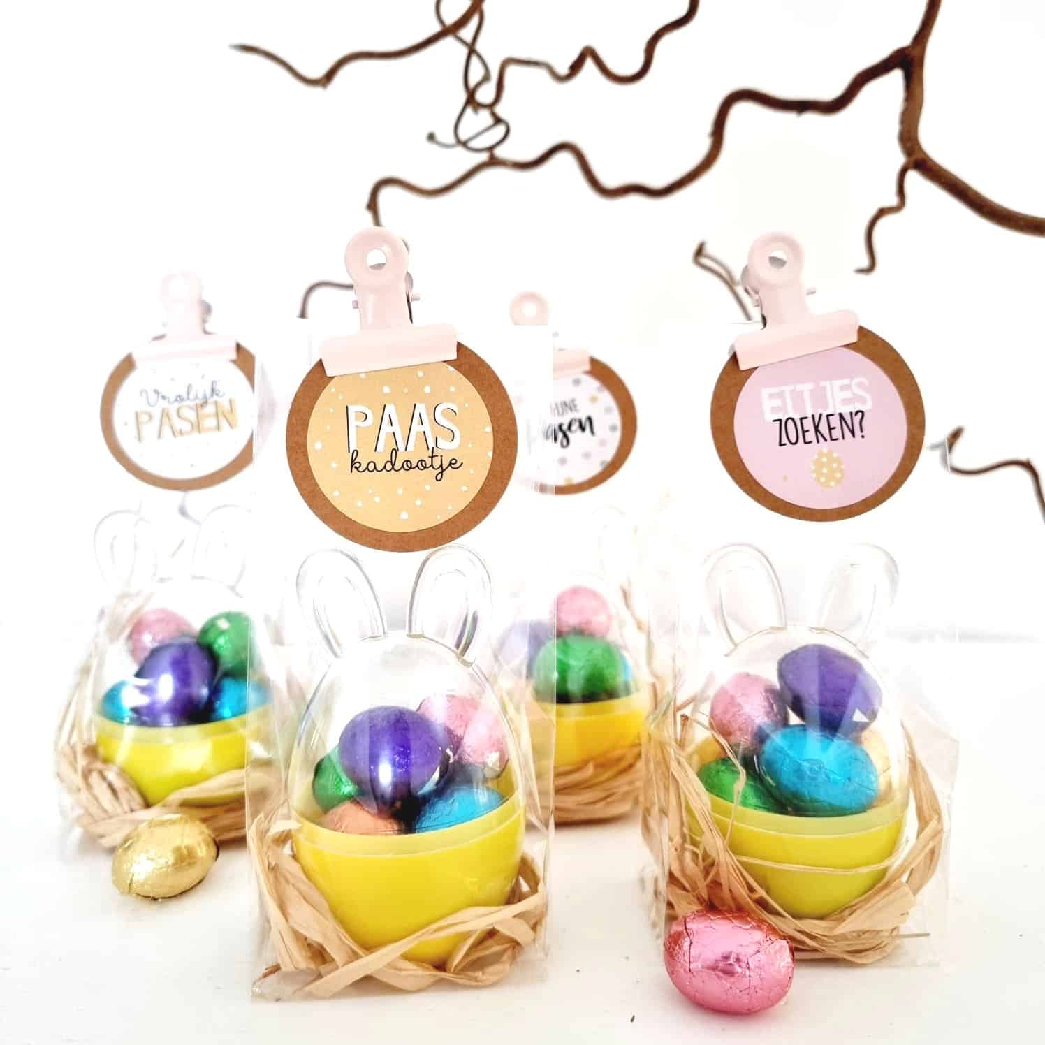 Vul de konijntjes met paaseitjes, mini marshmallows of andere lekkernijen. Voeg oogjes of snorharen toe voor een extra schattig effect. Leuk om te trakteren én om cadeau te geven!