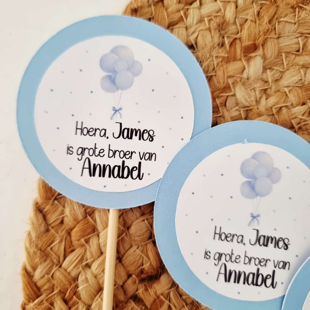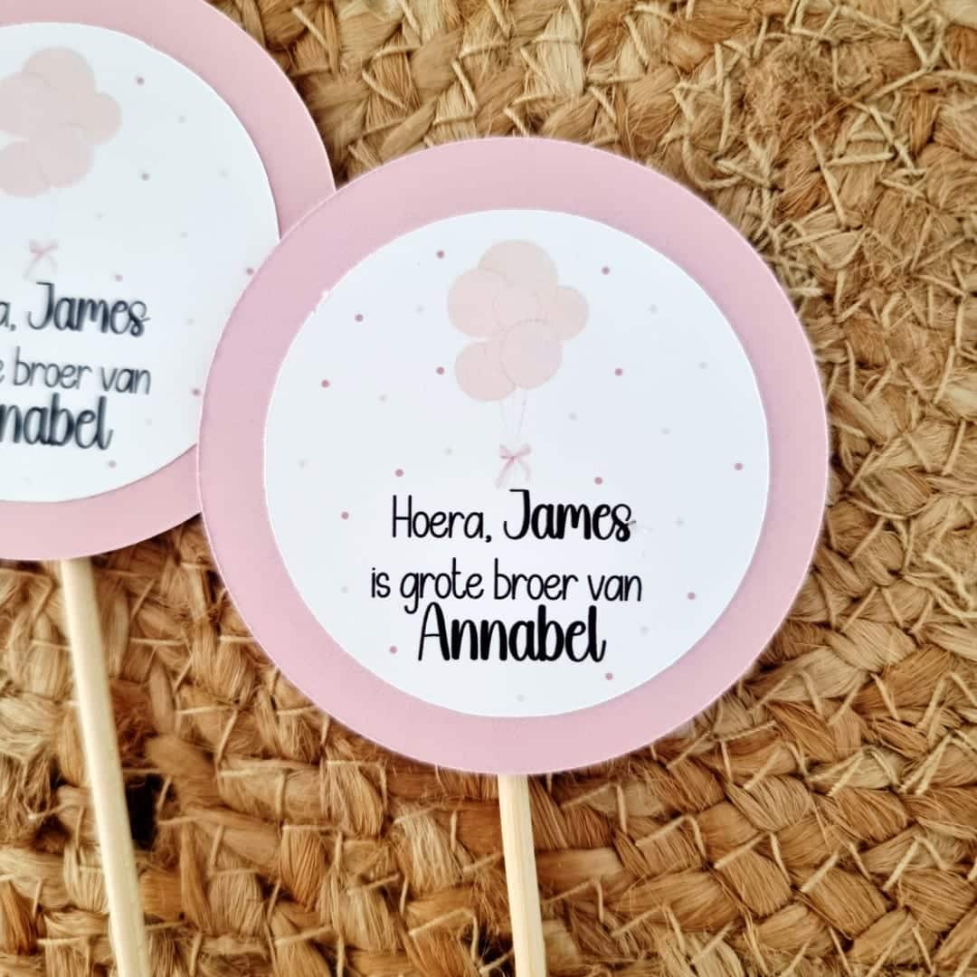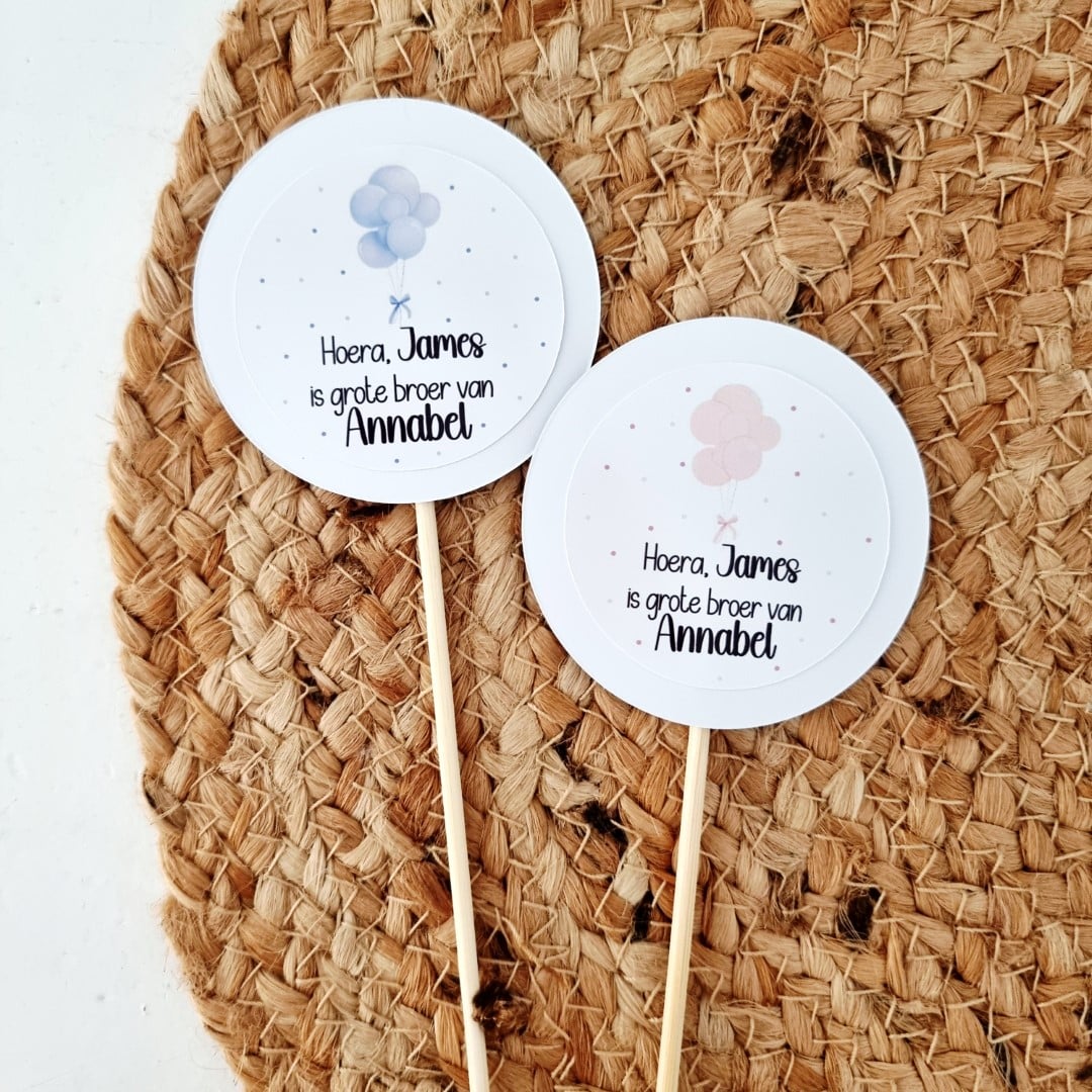 De stickers zijn verkrijgbaar in verschillende zachte kleurstellingen. Bij dit ballonnen ontwerp maken we geen gebruik van een bruin label. Je kunt kiezen uit labels in blauw, roze of wit, zodat de traktatieprikker perfect aansluit bij jouw thema.