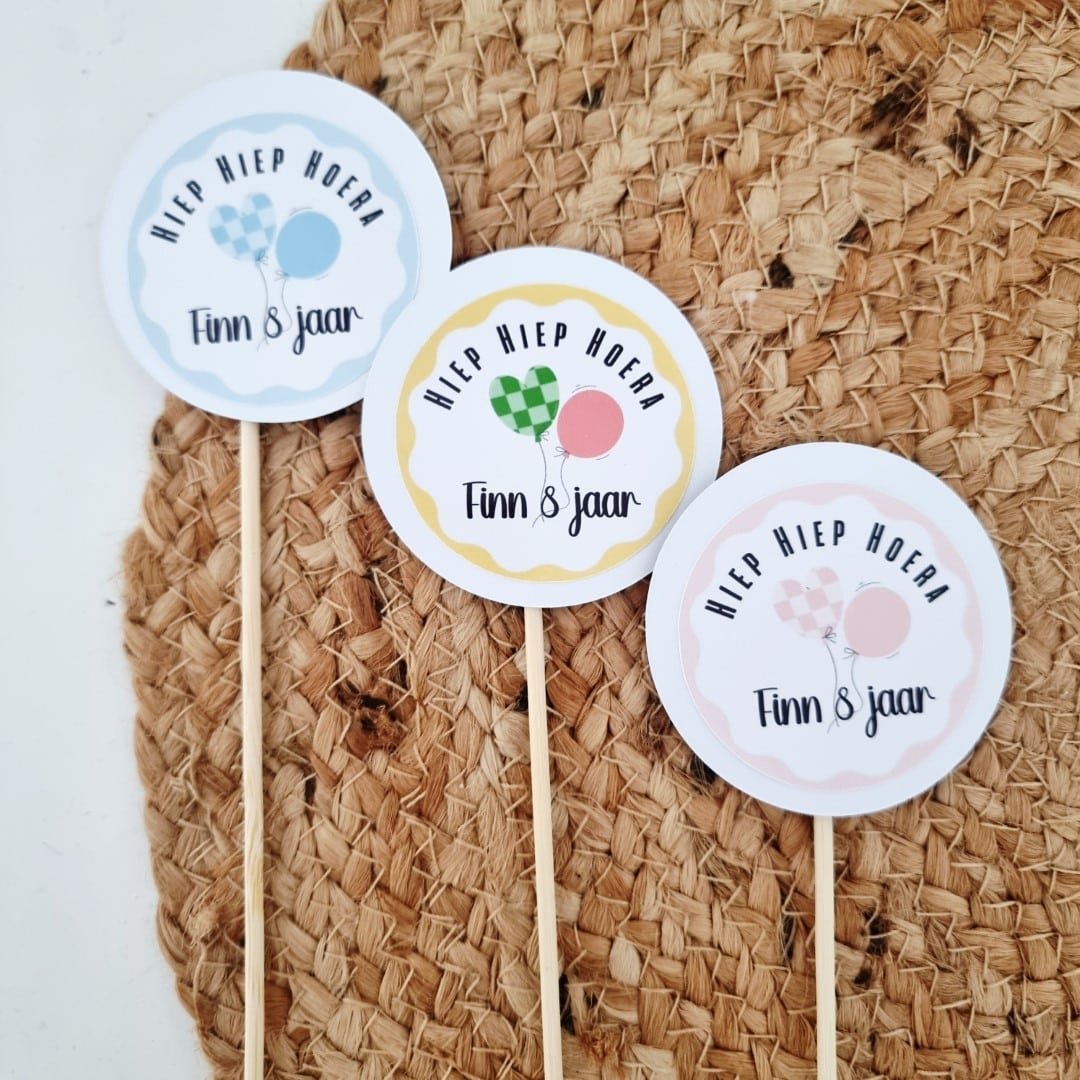 De ballonnen stickers zijn verkrijgbaar in roze, blauw en geel. Het label kan gekozen worden in wit, roze, blauw of bruin, waardoor je eenvoudig een combinatie samenstelt die past bij jouw verjaardagsthema.