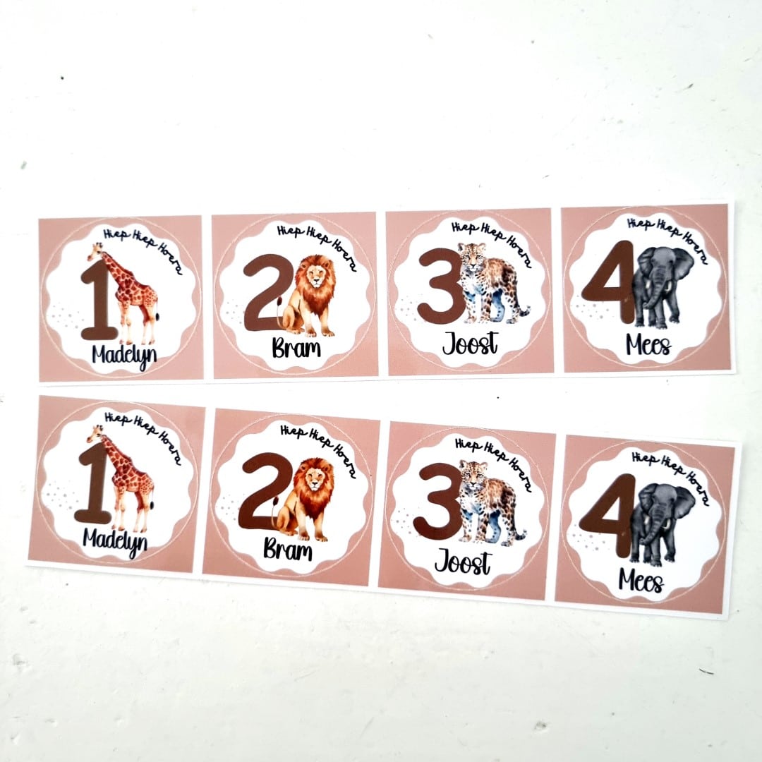 Bestel vandaag nog jouw verjaardag sticker met naam jungle dieren en maak elk feestmoment persoonlijk en herkenbaar.