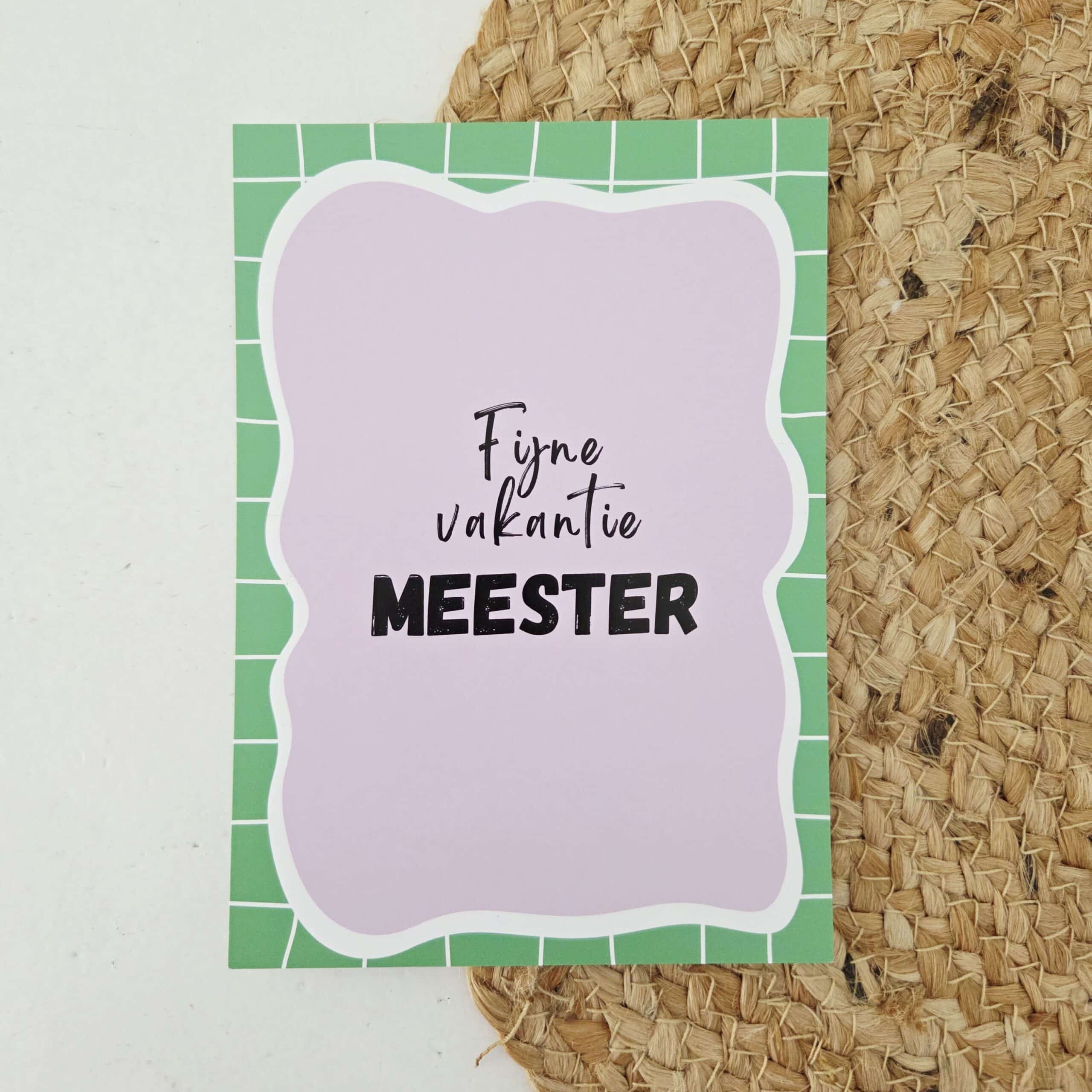 Het einde van het schooljaar is hét moment om waardering te tonen. Met deze kaart geef je een duidelijke en positieve boodschap mee. De tekst Fijne vakantie meester springt direct in het oog en maakt de kaart geschikt voor de laatste schooldag of een officieel afscheidsmoment.