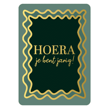 De wenskaart heeft een formaat van A6 (10,5 × 14,8 cm) en is afgewerkt met een speelse, golvende goudfolie rand. De combinatie van diep groen en goud zorgt voor een stijlvolle en warme look – ideaal voor een verjaardag of feestelijke felicitatie.