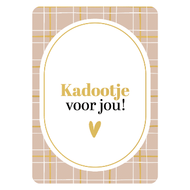 Maak je cadeautje compleet met deze elegante wenskaart met de tekst “Kadootje voor jou!”. Het warme ontwerp met beige ruitpatroon en gouden accenten zorgt voor een luxe uitstraling. Perfect om te combineren met een klein presentje voor ieder moment.
