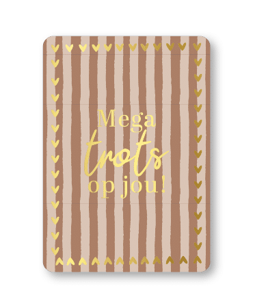 Wil je iemand écht laten weten hoe trots je bent? Met deze stijlvolle wenskaart “Mega trots op jou” geef je jouw boodschap extra impact. De combinatie van warme tinten en goudfolie zorgt voor een luxe en persoonlijke uitstraling. Perfect voor momenten waarop waardering centraal staat.