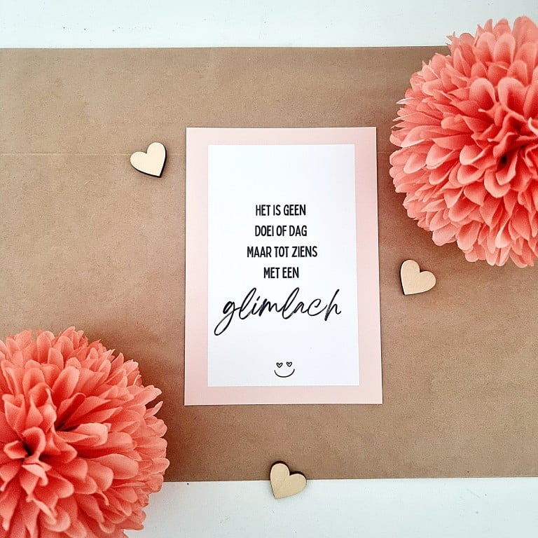 De kaart heeft een formaat van 105 x 148 mm en is per stuk verkrijgbaar. Het zachte roze kader en het kleine smiley-gezichtje onderaan geven de kaart een warme en optimistische uitstraling – ideaal voor een vriendelijk afscheid.