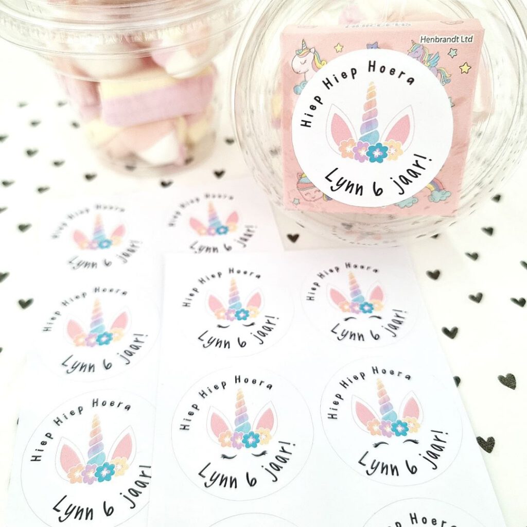 Deze verjaardagsticker met naam in een vrolijk eenhoorn design is een praktische oplossing voor traktaties die direct professioneel en persoonlijk