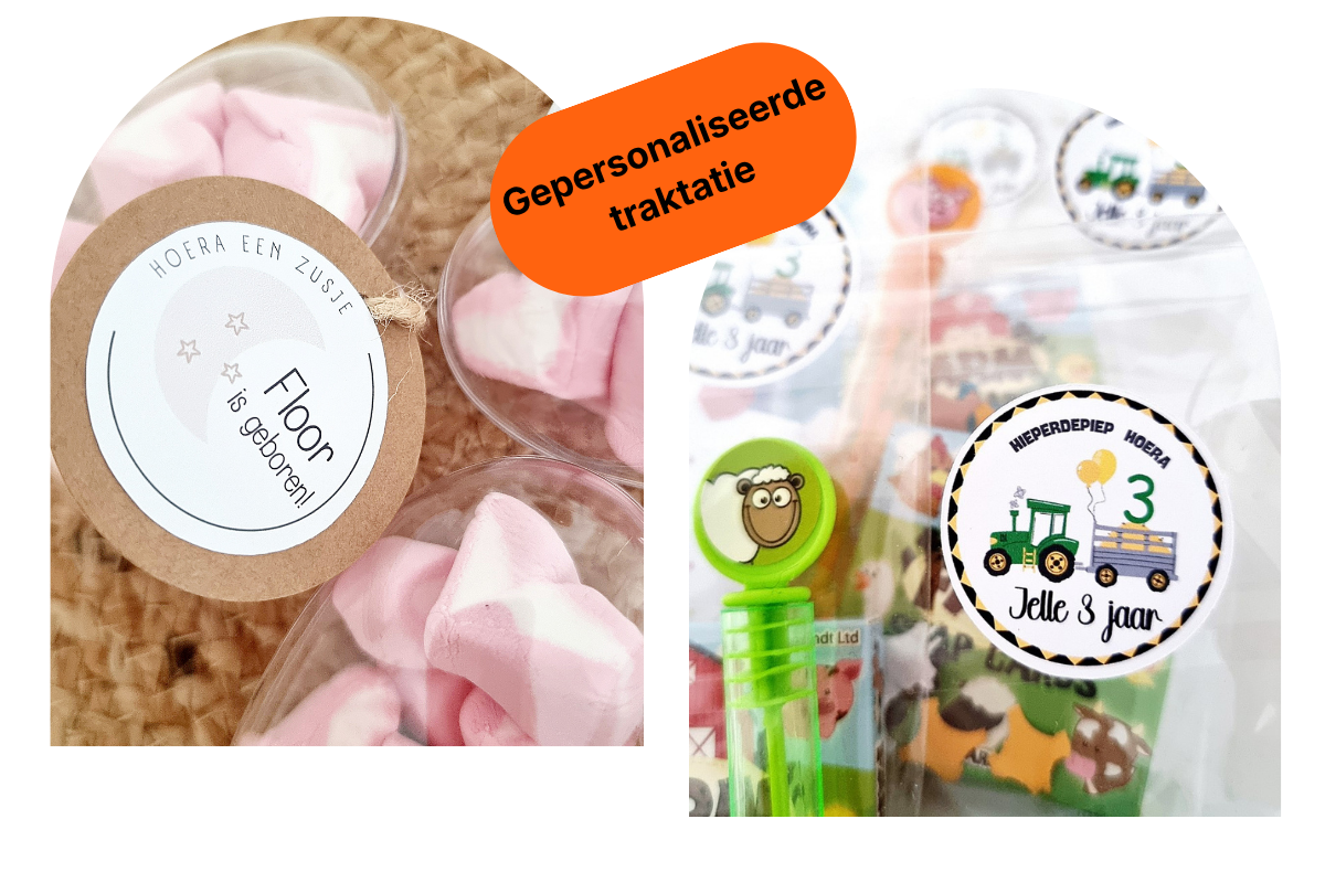 Maak jouw traktatie extra bijzonder met een gepersonaliseerde sticker. Onze kant en klare traktaties zijn direct klaar om uit te delen en worden eenvoudig voorzien van een naam of korte tekst.